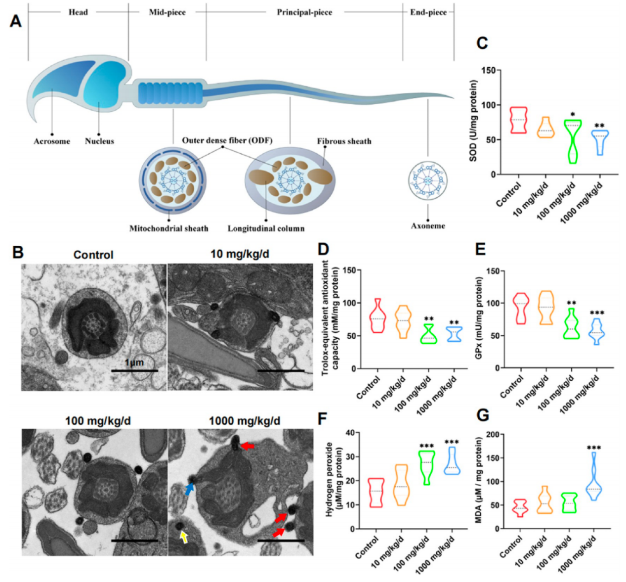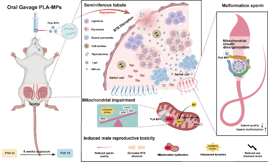 工业化的快速发展,给人类带来了环境和生活方式的改变,微塑料污染对人类健康造成了严重威胁,特别是严重影响了男性生殖健康。在该研究中,研究团队首次报道了聚乳酸(PLA)对雄性小鼠的生殖毒性,并证明聚乳酸微塑料(PLA-MP)暴露后会穿透血睾屏障(BTB)、侵入睾丸微环境,并在睾丸组织内蓄积;同时诱导小鼠睾丸的氧化应激水平升高、血清生殖激素水平降低,导致小鼠睾丸发育障碍。此外,PLA-MP降解成的纳米塑料会侵入精子线粒体鞘,破坏线粒体结构,提示了线粒体功能障碍是PLA诱导生殖毒性的潜在机制和早期关键影响。