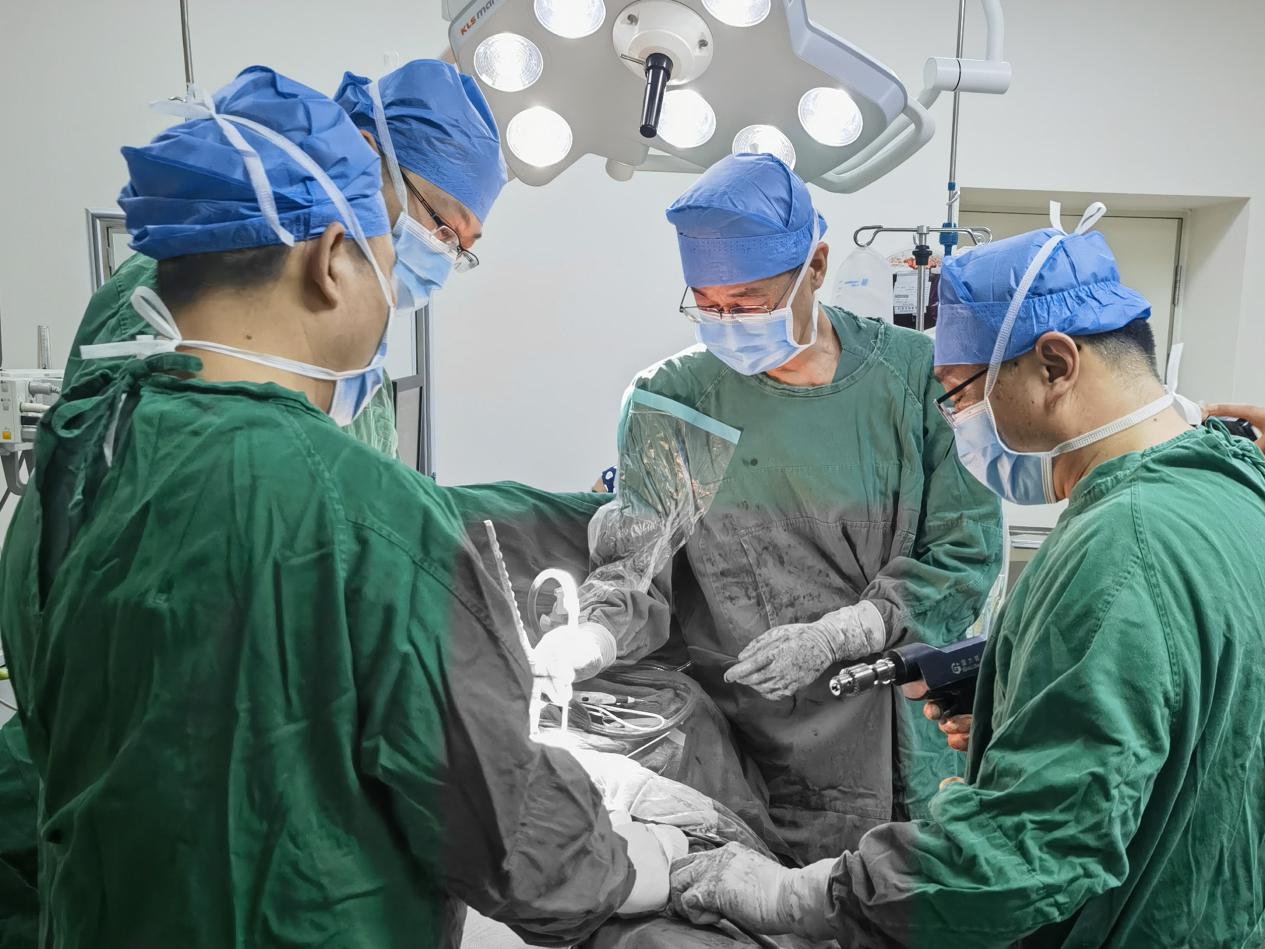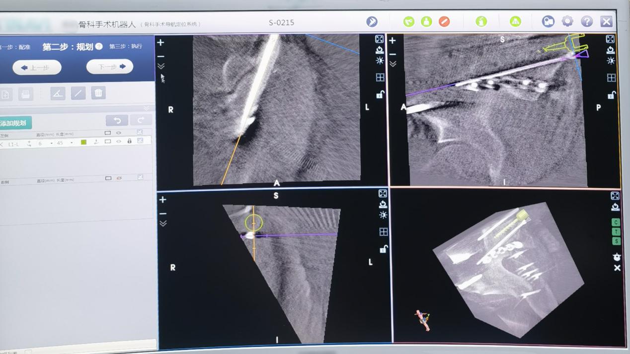 术中,应用骨科手术机器人微创辅助操作内固定技术,辅助开展创伤骨科手术,医生可以精准设计并置入内植入物。在患者脱位的骶髂关节暴露、准备复位骨折断端时,为防止骶髂关节骨折复位后,髂外动脉失去血肿压迫,有可能会迅速破裂导致大出血,徐执扬一面谨慎操作,一面严肃叮嘱:“看着血压、看着血压、看着血压。”在复位骨折脱位的一瞬间所有人的心都提到嗓子眼上了,都在全神贯注,只听见麻醉机发出滴滴的工作声音。徐执扬和吴冯胜合力将骨折脱位断端复位:“成功了!复位成功!”