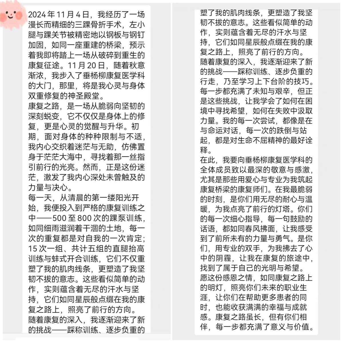 “2024年11月4日,我经历了一场漫长而精细的三踝骨折手术,左小腿与踝关节被精密地以钢板与钢钉加固,如同一座重建的桥梁,预示着我即将踏上一场从破碎到重生的康复征途。11月20日,随着秋意渐浓,我步入了垂杨柳康复医学科的大门,那里,将是我心灵与身体双重修复的神圣殿堂。