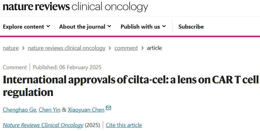 该文章以International approvals of cilta-cel: a lens on CAR T cell regulation(《西达基奥仑赛的跨国批准:透视CAR-T细胞疗法的监管》)为题,发表在Nature Reviews Clinical Oncology(《自然综述临床肿瘤学》)上,北京清华长庚医院临床药械试验中心主任、清华大学医学院研究员陈晓媛为本文通讯作者,北京清华长庚医院临床药械试验中心助理研究员葛诚浩为第一作者。国家药品监督管理局药品评审中心(CDE)在讨论CAR-T细胞疗法监管方面为本文提供了宝贵意见。本文亦获得传奇生物(Legend Biotech)、强生(Johnson & Johnson)团队、医药魔方Pharmcube数据库的支持。