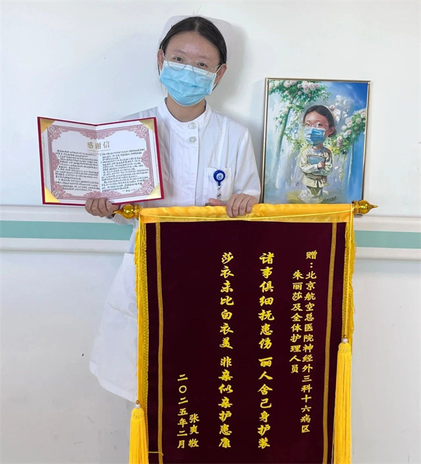 2月13日,航空总医院神经外三、十科/十六病区护理团队收到患者送来的“元宵节”礼物——一面鲜红的锦旗、一封满载深情的感谢信及一幅护士自画像。礼物来自一位刚刚康复出院的患者,表达对十六病区全体护理人员,特别感谢朱丽莎护士无微不至的关怀。