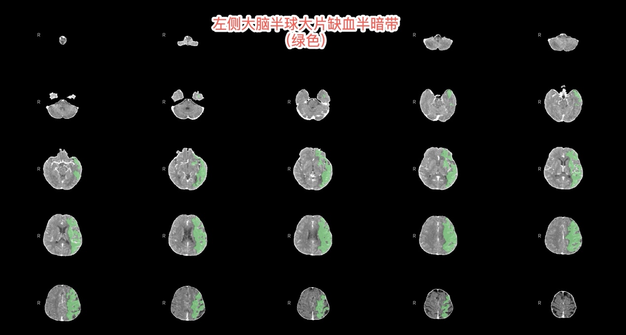 在移动监护设备全程护航下,患者被直接推送至CT室。头颈部CTA检查显示左侧颈内动脉完全闭塞——这是给大脑半球供血的核心通道,每延迟1分钟就有190万个神经元死亡。头部CTP提示左侧大脑半球大面积“缺血半暗带”,这部分脑组织是可以被挽救的脑组织,恢复血流可以恢复正常功能的脑组织。情况十分危急,时间就是大脑,越早开通梗死面积越小,预后就越好。