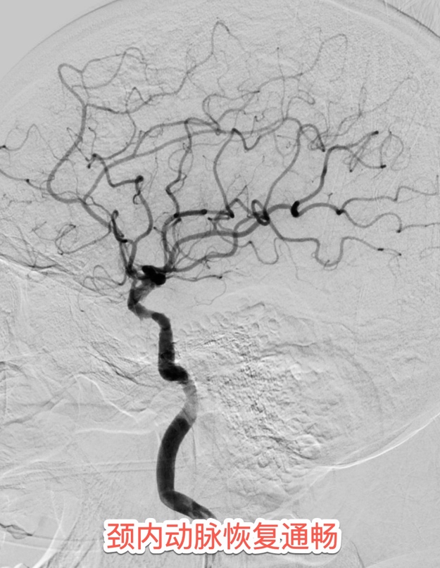 患者住院期间的心电图提示心房颤动病史,发病紧急,没有明显的前驱症状,考虑房颤栓子脱落所致的脑动脉栓塞。介入团队采用最新一代球囊Guilding导管,充盈球囊时可以阻断近段血流,避免血栓逃逸,同时经导管抽吸血栓,可以明显的提高血栓抽吸效率。最终在此先进的医疗技术下精准"抓捕"出大量团块状的暗红色血栓。