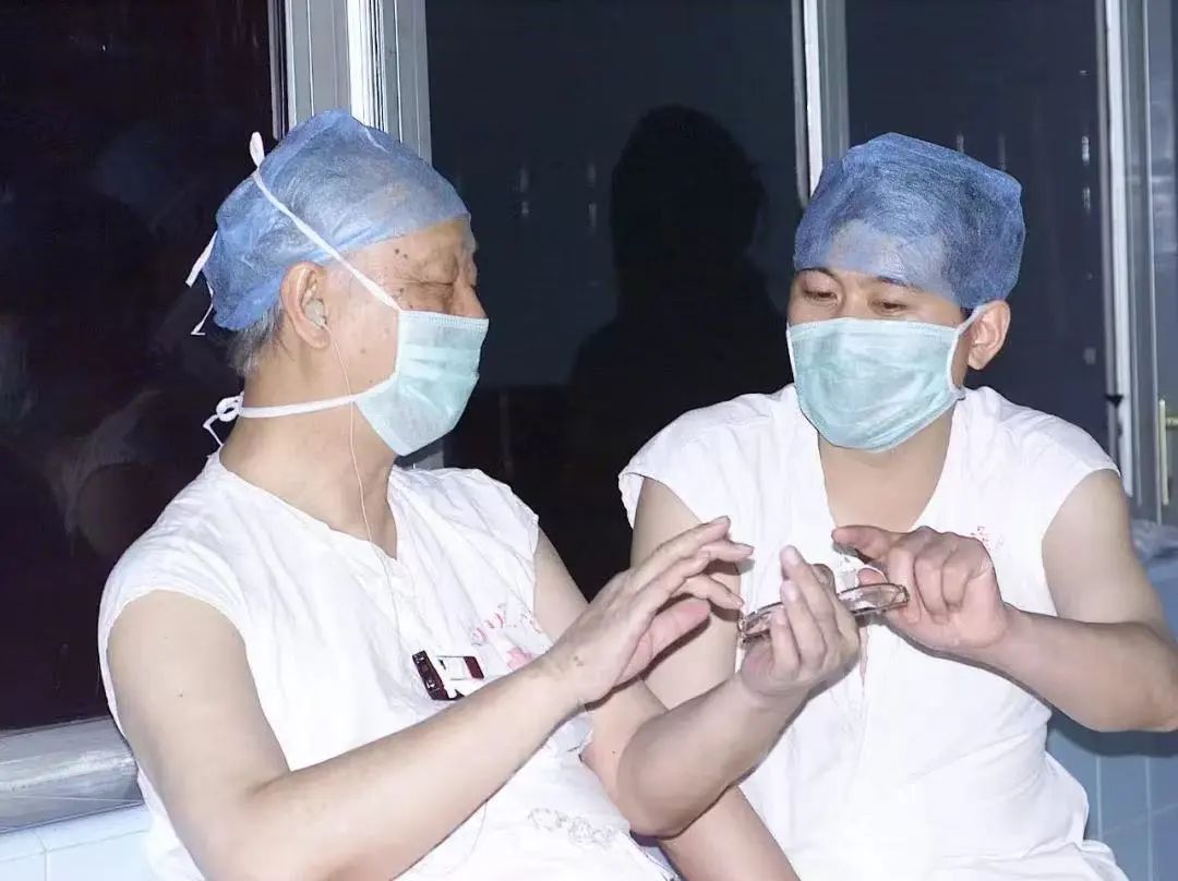 年轻时的董家鸿(右)正在与导师黄志强讨论一例手术方案