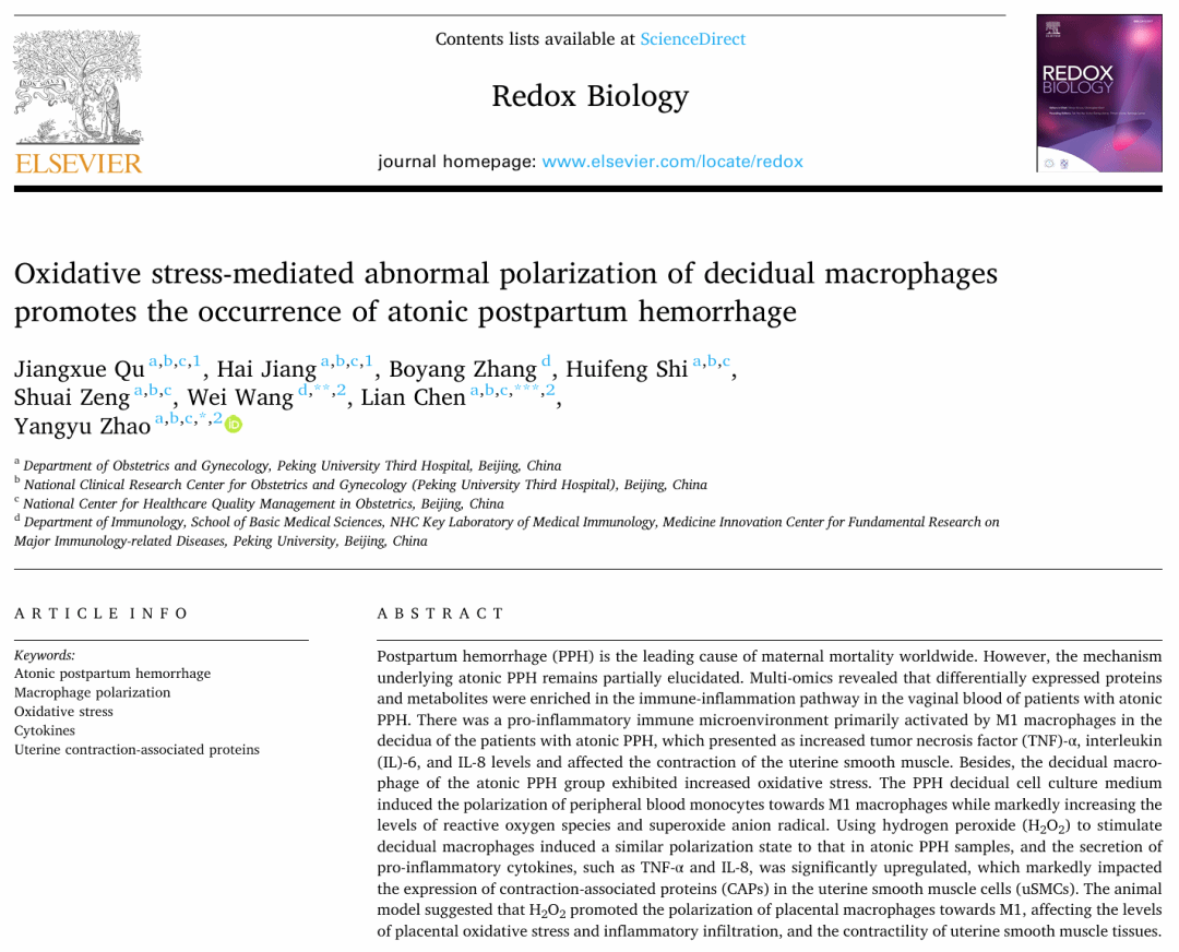 promotes the occurrence of atonic postpartum hemorrhage”(氧化应激介导的蜕膜巨噬细胞极化失衡促进宫缩乏力性产后出血的发生)的研究论文。