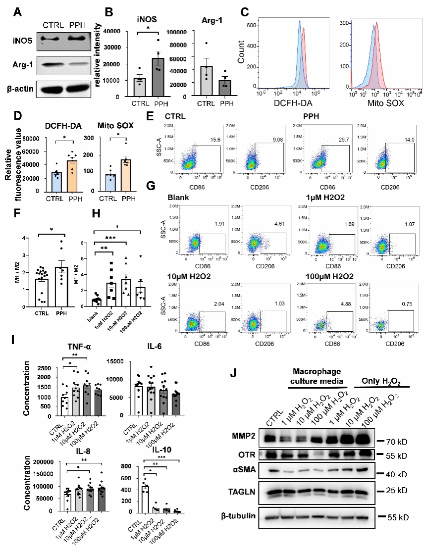 PPH组和对照组氧化水平和巨噬细胞极化的差异,以及H2O2刺激后巨噬细胞极化、细胞因子分泌的变化和对子宫平滑肌细胞收缩能力的影响