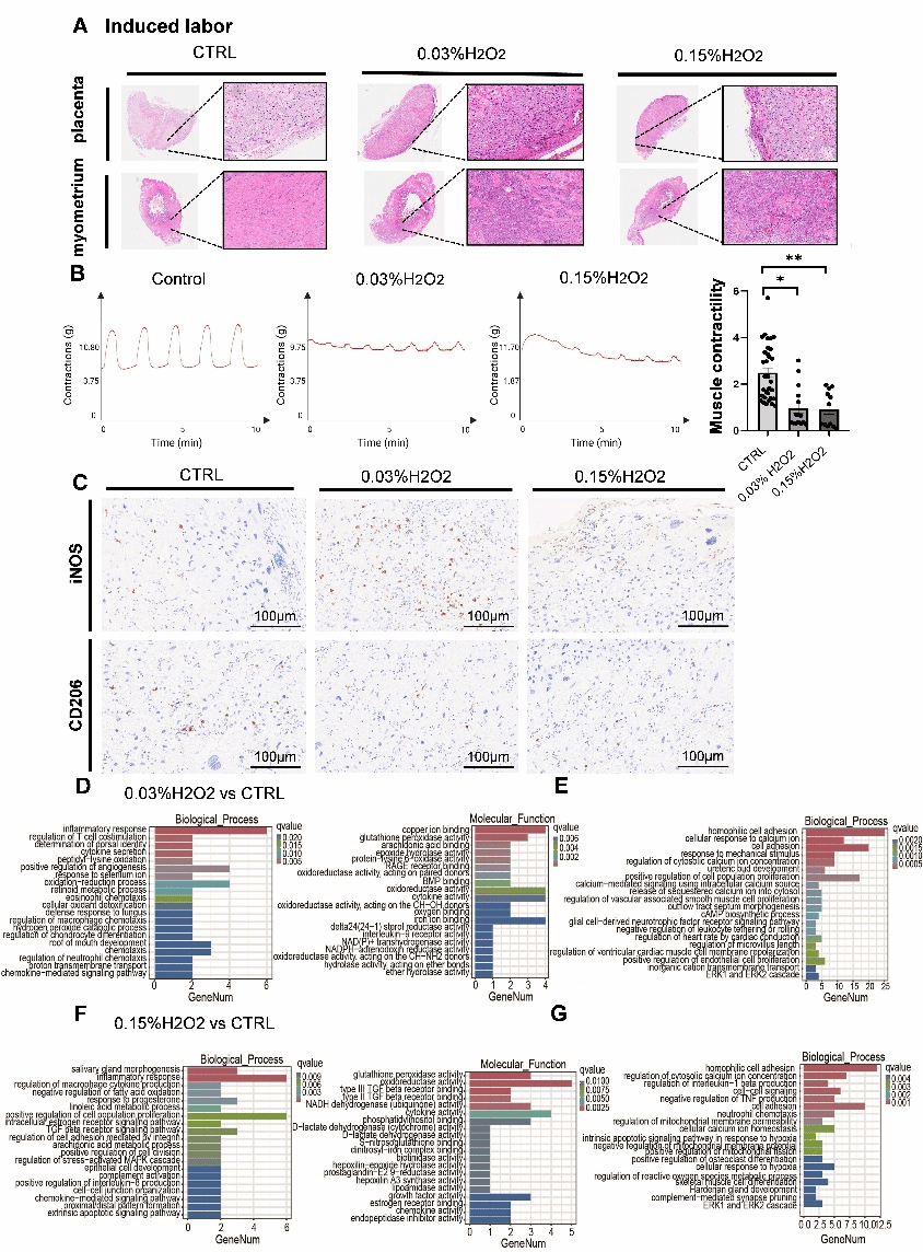 为了进一步验证这一机制,研究团队构建了孕大鼠模型,通过腹腔注射安全浓度的H2O2模拟氧化应激状态。结果显示,H2O2刺激后,胎盘巨噬细胞向M1型极化,胎盘氧化应激和炎症浸润水平显著增加,子宫平滑肌组织的收缩能力显著下降。这一发现与临床样本中的结果一致,进一步证实了氧化应激通过诱导巨噬细胞极化,促进促炎细胞因子的分泌,进而抑制子宫平滑肌收缩的机制。