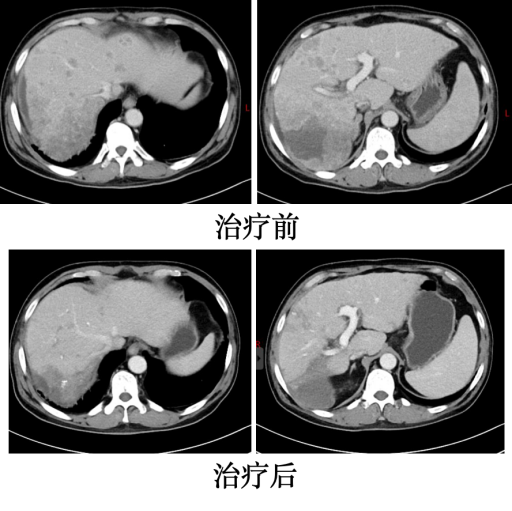 入院时,患者营养状态差,双下肢水肿,腹胀明显,且有丙肝肝硬化病史。腹部增强CT检查显示,患者右肝存在巨大肿瘤,直径约10厘米,肝内散在转移癌灶,腹腔多发淋巴结转移,同时伴有肝硬化、脾大、门静脉高压等症状。经过全科讨论,医生团队制定了营养支持、保肝等治疗方案,等待患者状态好转后,进一步实施“减轻肿瘤负荷+局部强化+全身抗癌”的立体综合治疗。