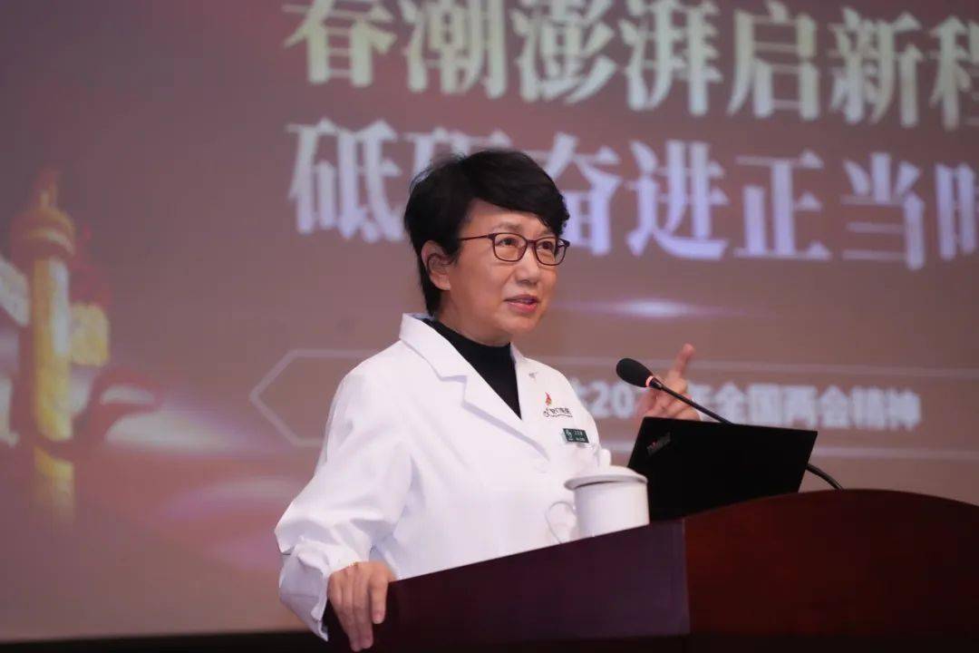 广安门医院党委书记刘震在总结讲话中指出,全国两会擘画了中国式现代化的宏伟蓝图,政府工作报告展现出强大的战略定力和坚定的民生关怀,必将引领中国经济社会发展迈向新高度。他强调,全院要深刻理解把握全国两会精神,切实同党中央保持一致,突出机制建设推动中医药传承创新发展,尽快将两会精神转化为推动我院发展的具体举措。要积极响应国家卫健委号召,积极落实“体重管理年”“儿科和精神卫生服务年”要求,充分发挥中医药在慢病管理、防治结合方面的优势特色,将疾病治疗向健康管理延伸,为推动健康中国建设贡献广安门医院力量。刘震书记鼓励全院干部职工以凝聚人心、凝聚共识、凝聚智慧、凝聚力量“四个凝聚”原则为指引,坚定信心,直面挑战,奋力书写中医药传承创新发展和医院高质量发展新篇章!