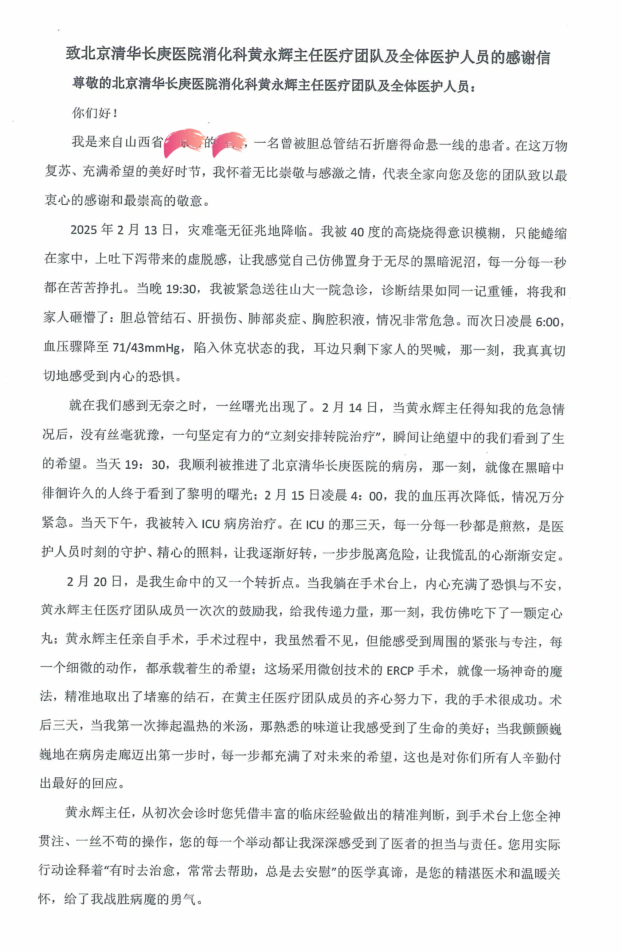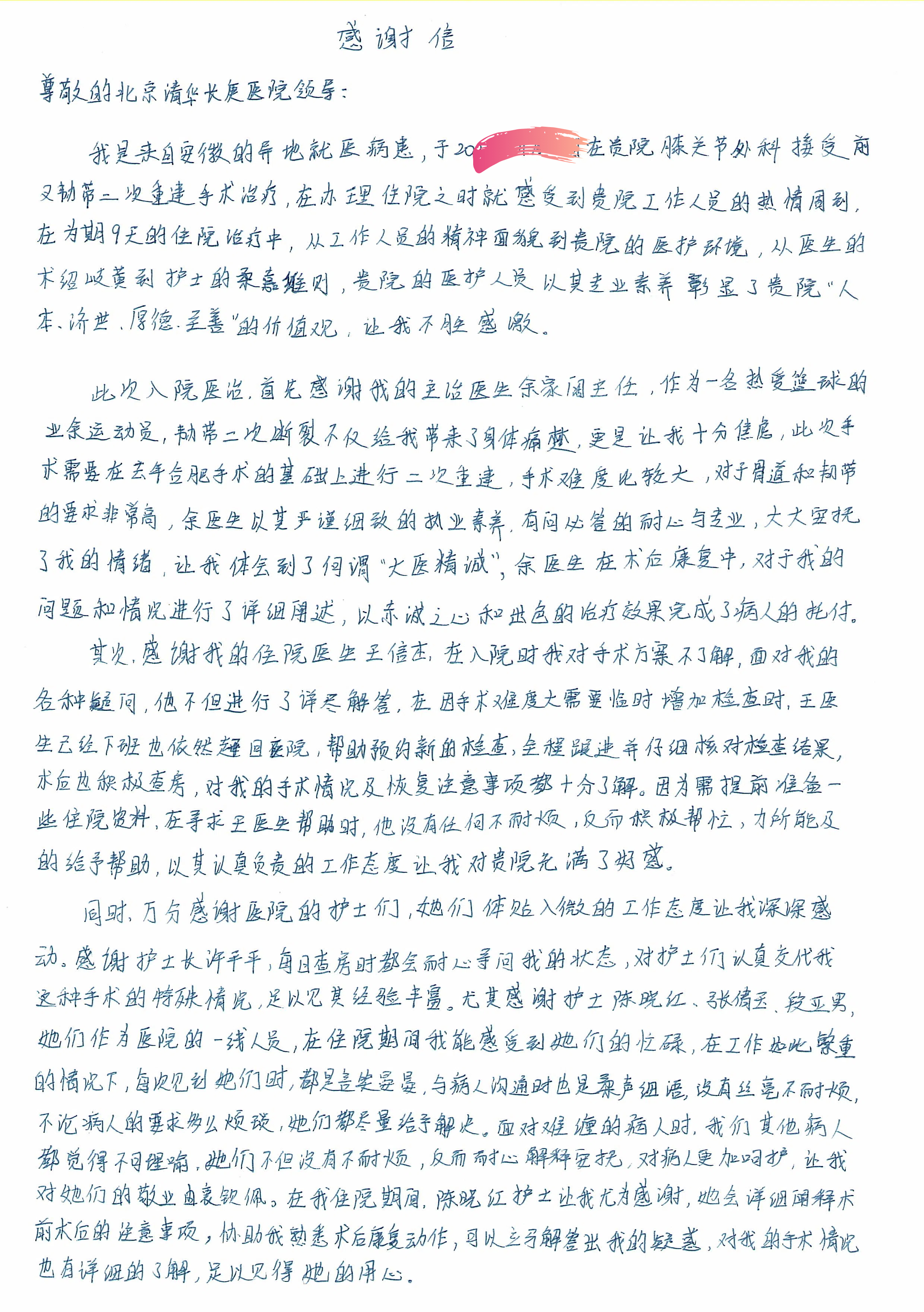 “入院治疗,是病患性命相托;专业诊治,医护人员敬业尽责,在忙碌繁杂之余,给予患者精神上的抚慰,是清华长庚医院的医德昭显。”