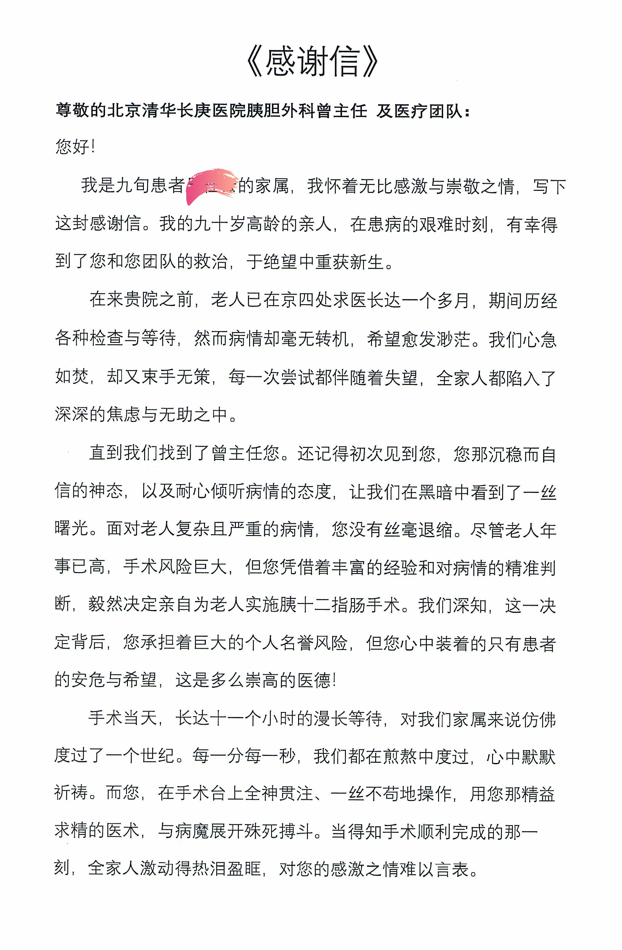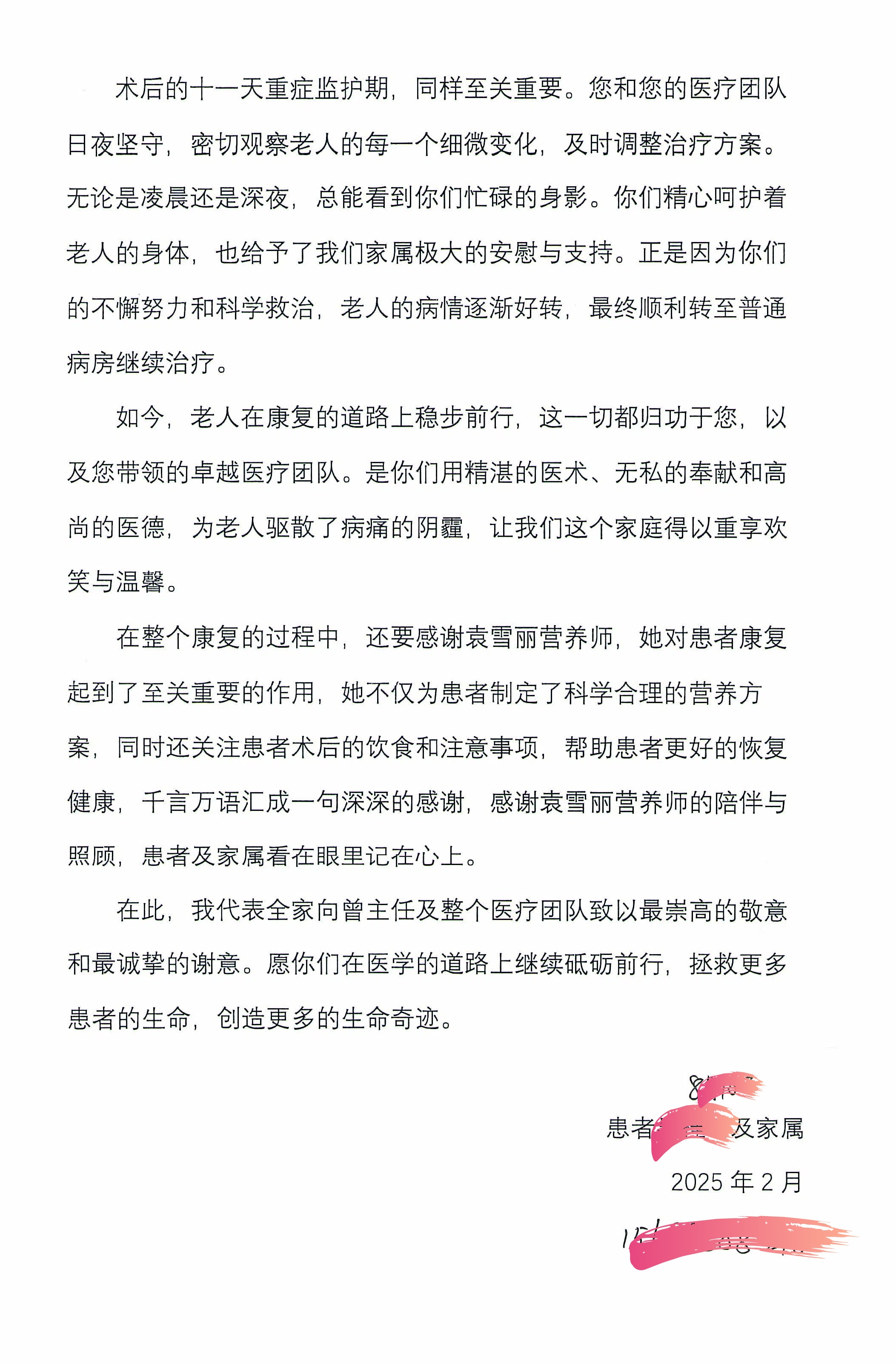 “手术当天,长达十一个小时的漫长等待,对我们家属来说仿佛度过了一个世纪。每一分每一秒,我们都在煎熬中度过,心中默默祈祷。而您,在手术台上全神贯注、一丝不苟地操作,用您那精益求精的医术,与病魔展开殊死搏斗。当得知手术顺利完成的那一刻,全家人激动得热泪盈眶,对您的感激之情难以言表。”