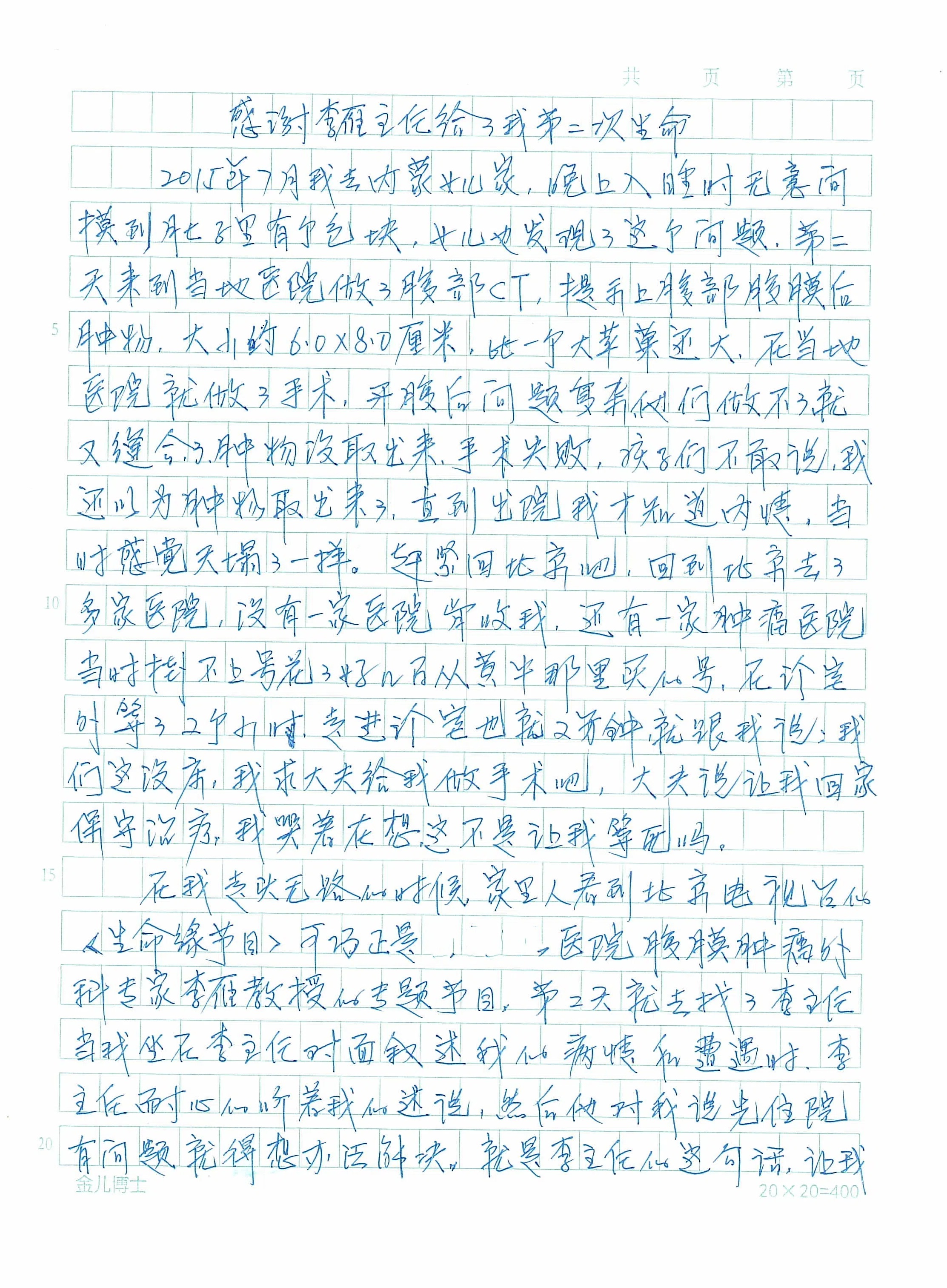 “身体一点一点的好起来,这种重生或充满希望的感觉是我终生难忘的。该出院了,李主任嘱咐我回去好好休息,我最后向李主任鞠躬表达谢意,我又泪流满面了。”
