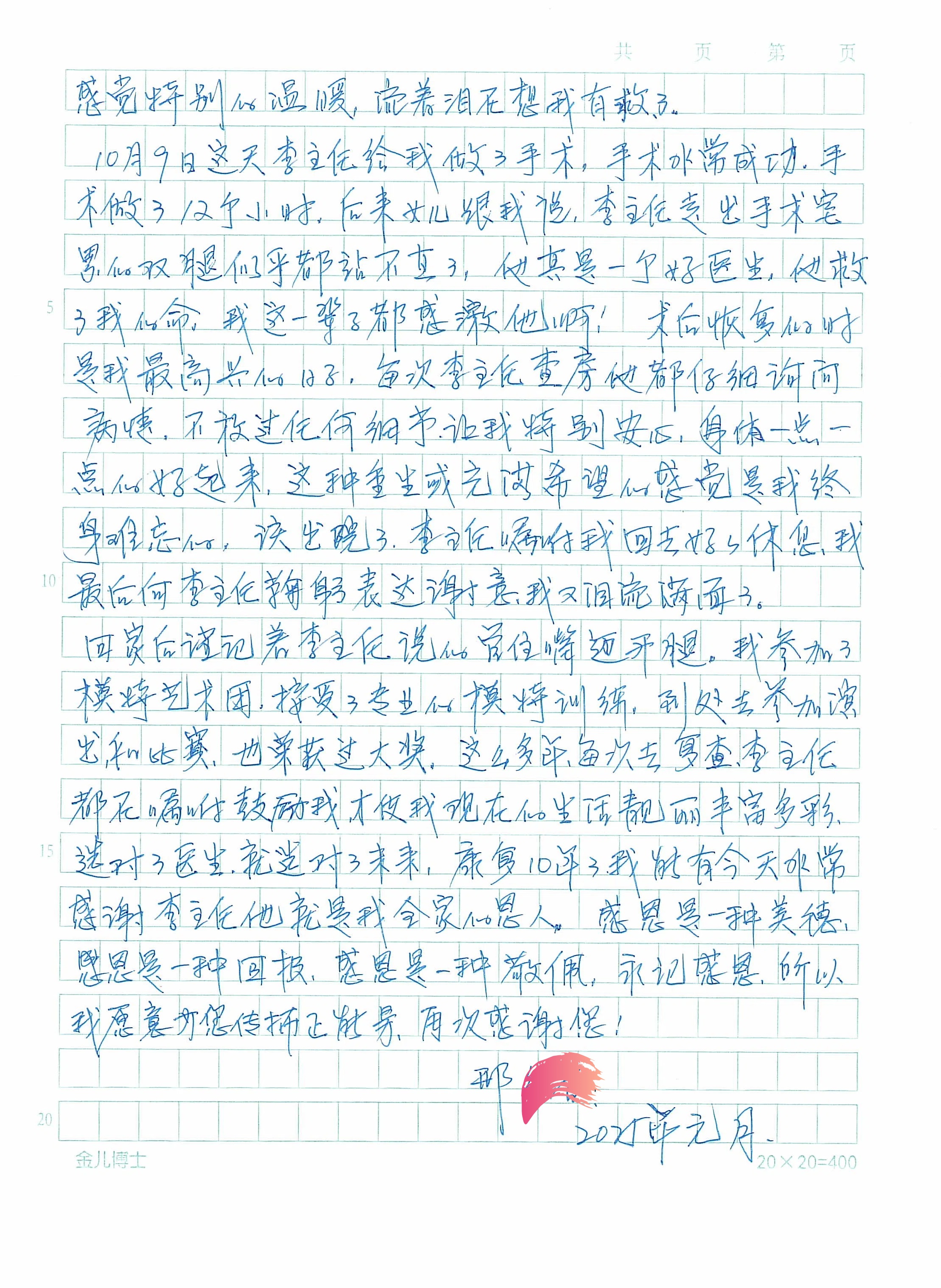 “术后三天,当我第一次捧起温热的米汤,那熟悉的味道让我感受了生命的美好;当我颤颤巍巍地在病房走廊迈出第一步时,每一步都充满了对未来的希望,这也是对你们所有人辛勤付出最好的回应。”