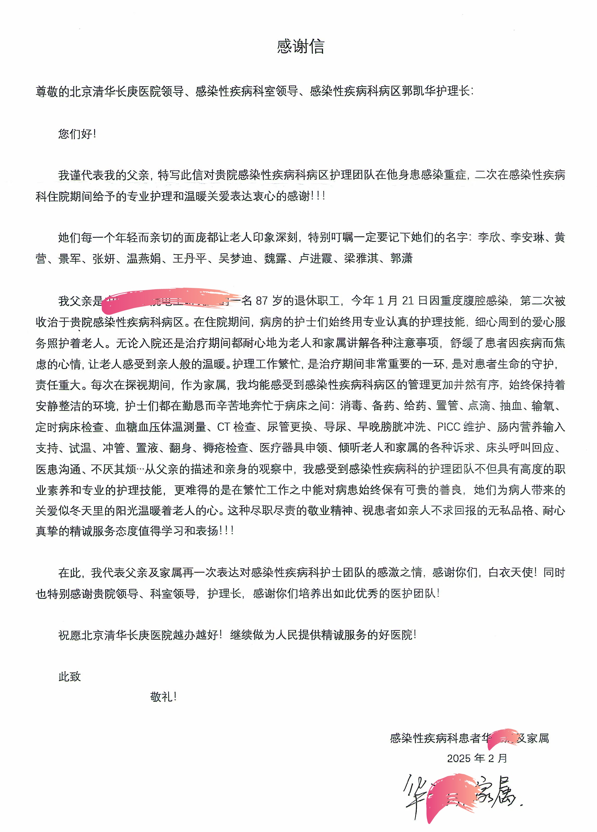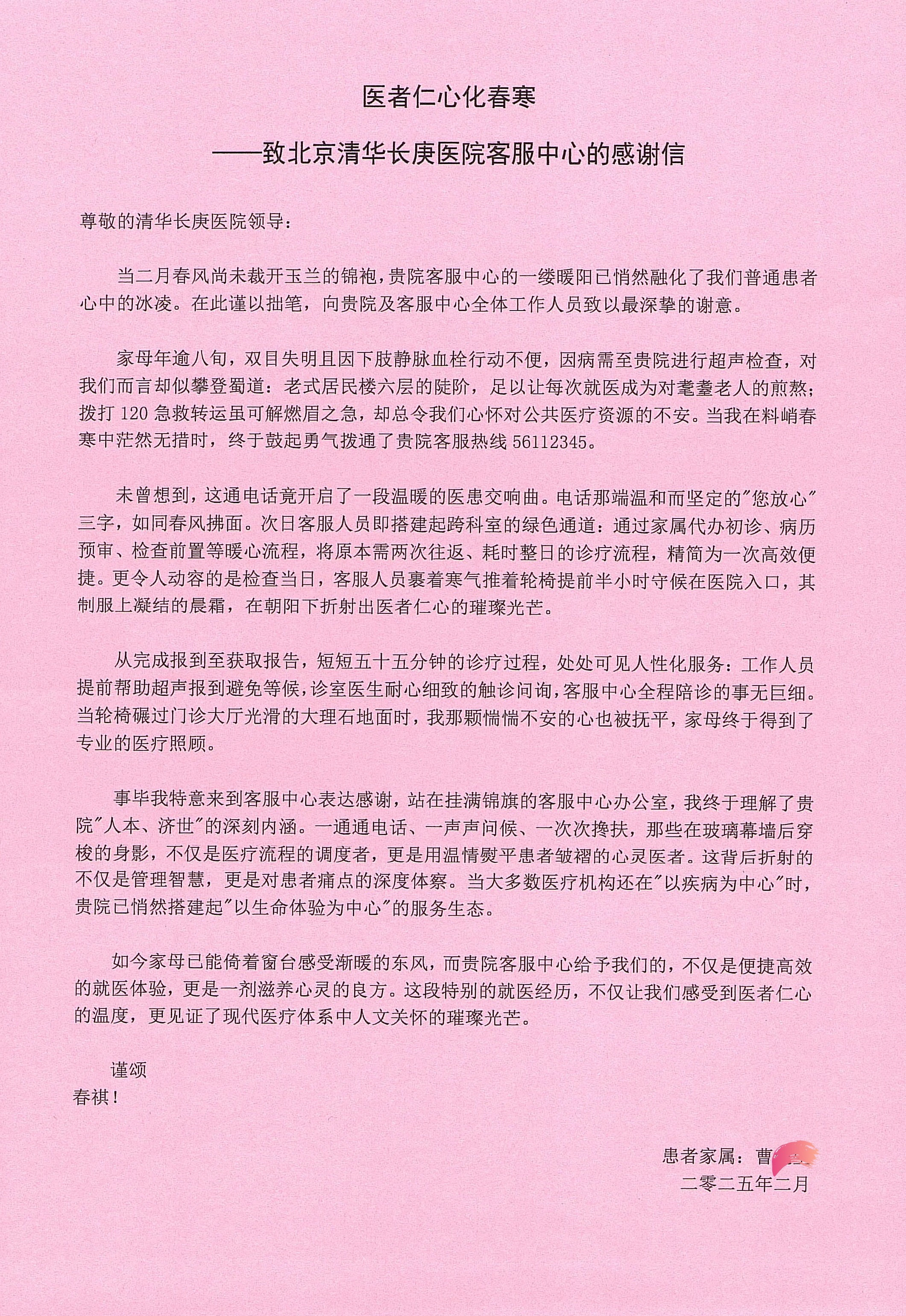 “如今家母已能倚着窗台感受渐暖的东风,而贵院客服中心给予我们的,不仅是便捷高效的就医体验,更是一剂滋养心灵的良方。这段特别的就医经历,不仅让我们感受到医者仁心的温度,更见证了现代医疗体系中人文关怀的璀璨光芒。”