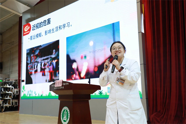 守护学生的“睛”彩世界。张国芳利用眼球结构模型解析近视成因,从近视的形成、危害及预防与控制、近视的护眼误区等三个方面进行了近视防控的详细介绍。她提醒学生们近视防控需要从小做起,养成良好的用眼习惯,减少电子产品的使用时间,增加户外活动,定期进行视力检查,做到早发现、早干预。