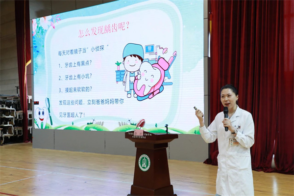 保护口腔,从“齿”开始。李欢从一系列的牙科小知识提问开始,“牙齿最多的动物是什么?”“牙齿长得最快的动物是什么?”寓教于乐的教大家正确认识自己的牙齿、告知大家什么是龋齿及如何保护好牙齿、教导大家牙膏、牙刷的正确选择,通过生动的讲解和现场互动教大家科学正确的刷牙办法,最后提醒大家每半年检查一次牙齿,有牙齿问题早发现早治疗。