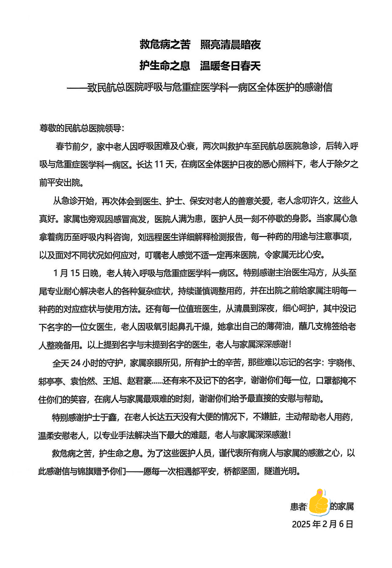 在这个春意渐浓、万物复苏的季节里,我们收到了一封来自患者家属的深情感谢信。信中,患者家属用最真挚的语言,表达了对民航总医院呼吸与危重症医学科一病区全体医护人员的感激之情。