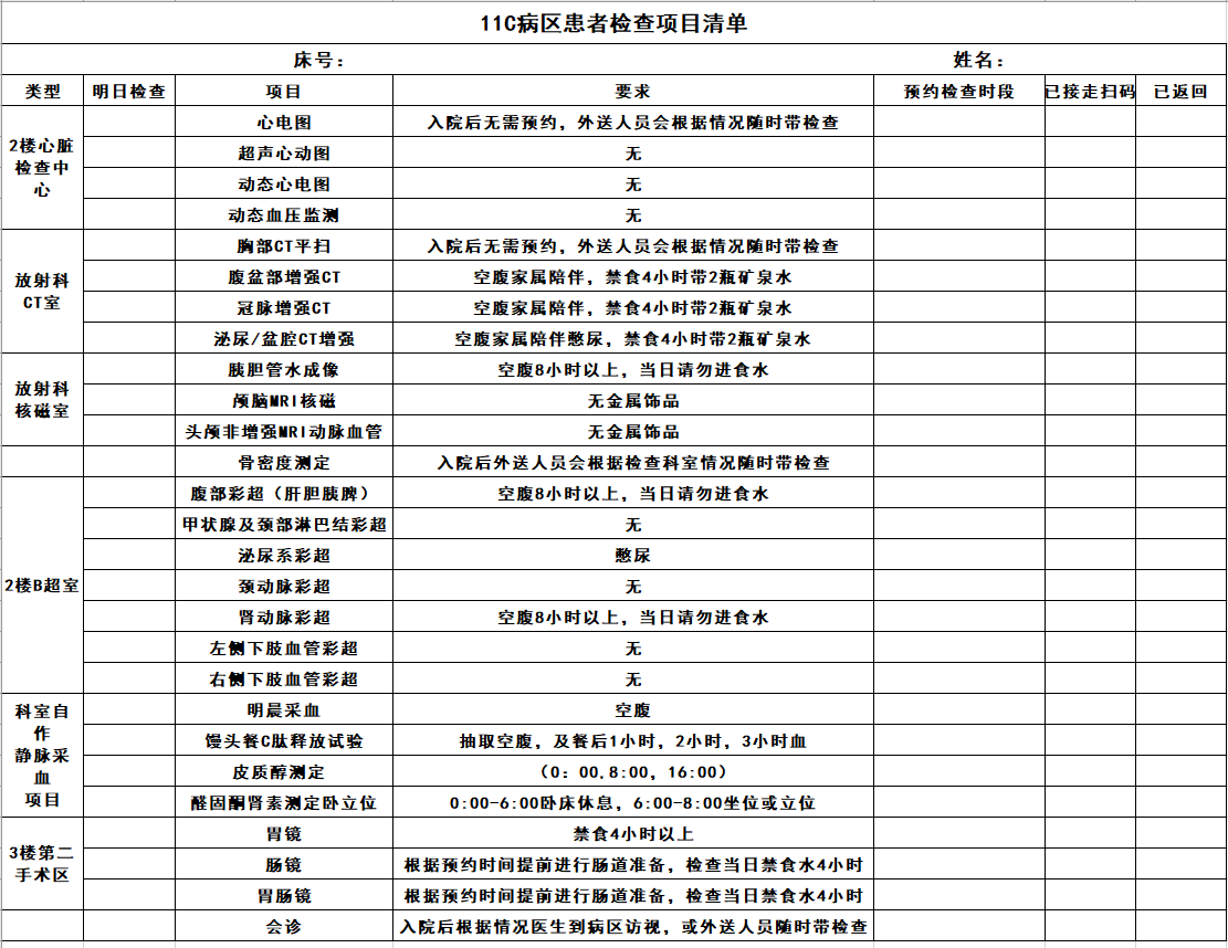 住院患者常抱怨:“检查项目根本记不住时间!”医护们想了个好办法:给每位患者床头挂一张塑封检查清单。清单上印着常规项目,比如:采血、超声、心电图、CT、MRI等,每项后面标注注意事项、预约检查时段、检查接走时扫码及是否按时返回等。