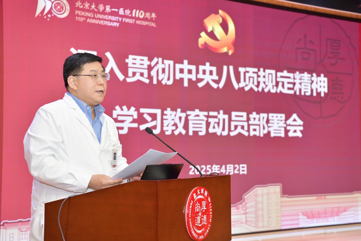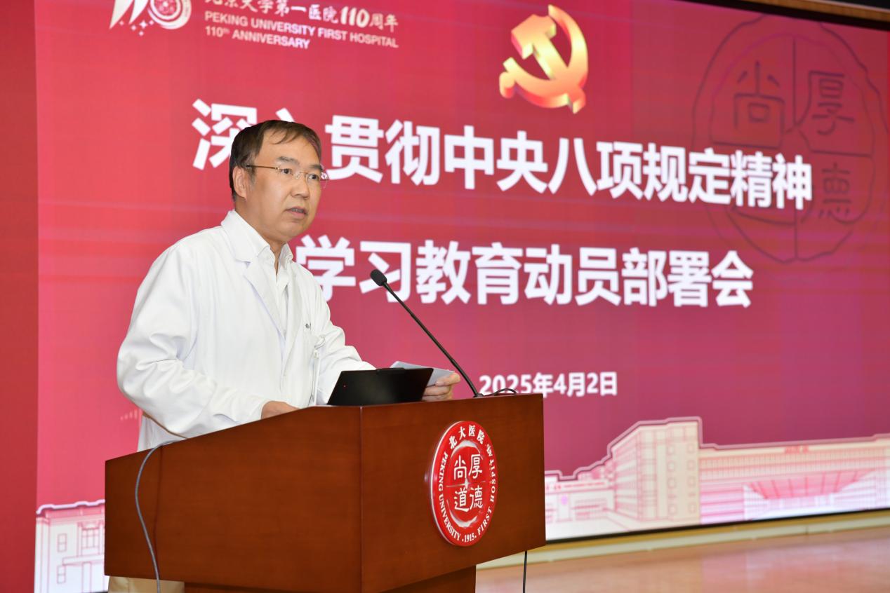 为贯彻落实党的二十届三中全会部署,巩固拓展学习贯彻习近平新时代中国特色社会主义思想主题教育成果,巩固深化党纪学习教育成果,锲而不舍落实中央八项规定精神,推进作风建设常态化长效化,4月2日下午,北京大学第一医院党委召开深入贯彻中央八项规定精神学习教育动员部署会。党委书记姜辉,党委副书记、院长杨尹默,以及党政领导班子成员、党委委员、纪委委员、党总支书记、党支部书记、临床、医技科室正/副主任、研究所正/副所长、科护士长、职能处室正副主任/处长等到场参会。会议由党委副书记、院长杨尹默主持。