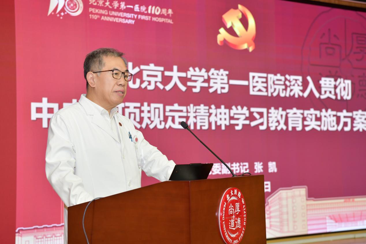 党委副书记、副院长张凯部署了《北京大学第一医院深入贯彻中央八项规定精神学习教育实施方案》(以下简称《实施方案》),强调各党总支、党支部要抓好动员部署,扎实学习研讨,组织全体党员学习习近平总书记关于加强党的作风建设的重要论述和中央八项规定及其实施细则精神;深入查摆问题,自觉对标对表,全面深入查找落实中央八项规定及其实施细则精神方面存在的问题,运用由风及腐案例加强警示教育;切实集中整治,立查立改、即知即改,列出清单,逐项制定整改措施,狠抓整改落实;注重开门教育,深入群众开展调研,自觉接受群众监督,加强和改进调查研究,聚焦群众“急难愁盼”的突出问题,采取更实的工作举措来推动解决。