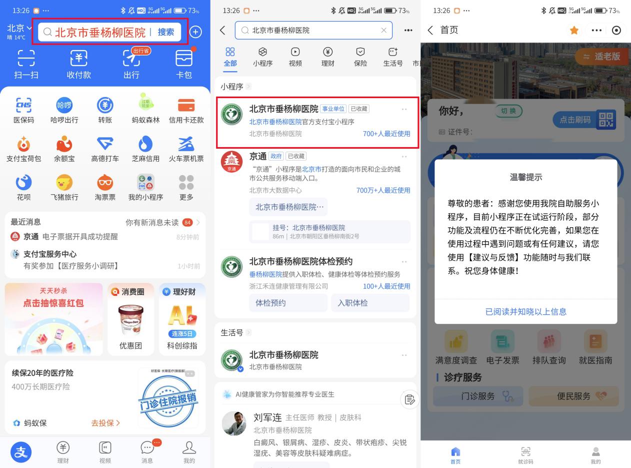 打开手机支付宝,搜索“北京市垂杨柳医院”。选择“北京市垂杨柳医院官方支付宝小程序”(注意要选择“事业单位”蓝标认证),点击进入小程序,确认个人身份。