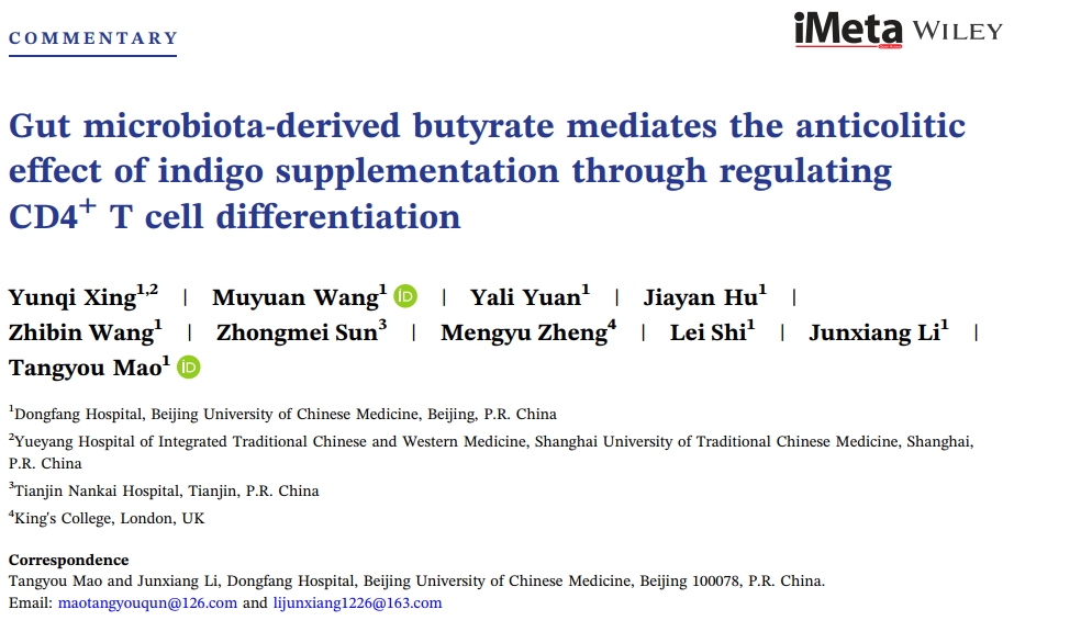 近日,北京中医药大学东方医院李军祥、毛堂友团队在iMeta杂志(IF:23.8,中科院分区生物学1区TOP顶刊)在线发表了Gut microbiota-derived butyrate mediates the anticolitic effect of indigo supplementation through regulating CD4+T cell differentiation(肠道菌群衍生的丁酸通过调节CD4+T细胞分化介导靛蓝对溃疡性结肠炎的治疗作用)的研究论文,首次揭示了中药青黛有效成分靛蓝治疗溃疡性结肠炎的分子机制。北京中医药大学消化病研究院院长、北京中医药大学东方医院脾胃肝胆科李军祥教授和实验医学中心毛堂友副主任医师为该论文的通讯作者,北京中医药大学东方医院为第一且唯一通讯单位;该研究得到中央高水平中医医院临床科研业务费资助、国家自然科学基金、首都卫生发展科研专项等课题的资助,也获得了北京中医药大学东方医院脾胃肝胆科、实验医学中心等临床及科研平台的大力支持。