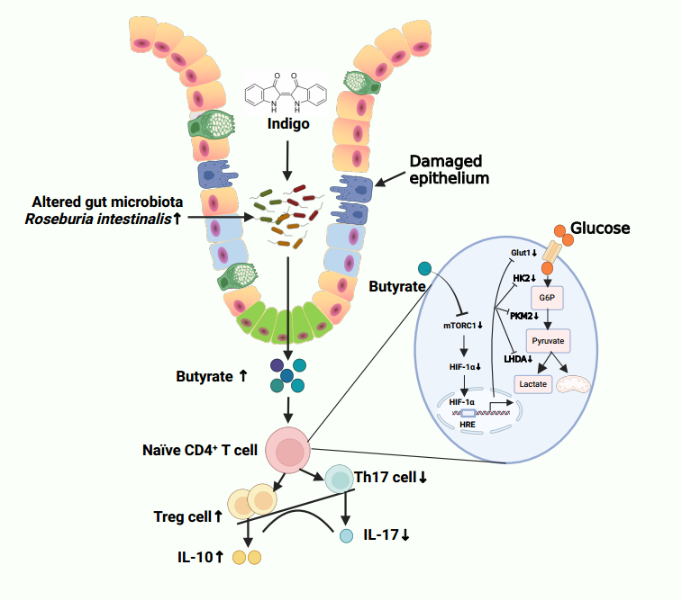 该研究团队采用自由饮用葡聚糖硫酸钠诱导UC小鼠模型,发现靛蓝可显著减轻UC小鼠肠道的炎症反应、重塑Th17/Treg细胞免疫平衡。值得注意的是,体外实验表明,靛蓝并不直接调控naïve CD4+T细胞分化而恢复Th17/Treg平衡,而是以肠道菌群依赖的形式,这在抗生素实验中得到了证实。此外,靛蓝调节后的肠道菌群、益生菌R. intestinalis及其代谢物丁酸均可有效抑制UC小鼠的炎症,重塑Th17/Treg细胞免疫平衡。机制方面,基于人源性CD4+T细胞实验发现,丁酸可通过激活mTORC1/HIF-1α信号通路调节naïve CD4+T细胞的代谢重编程,从而调控其分化,重塑Th17/Treg免疫平衡。临床样本分析也显示,UC患者存在显著的Th17/Treg失衡、肠道菌群失调以及降低的丁酸水平。