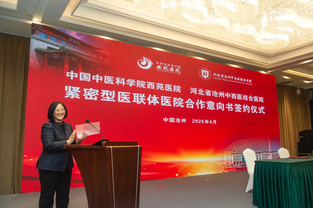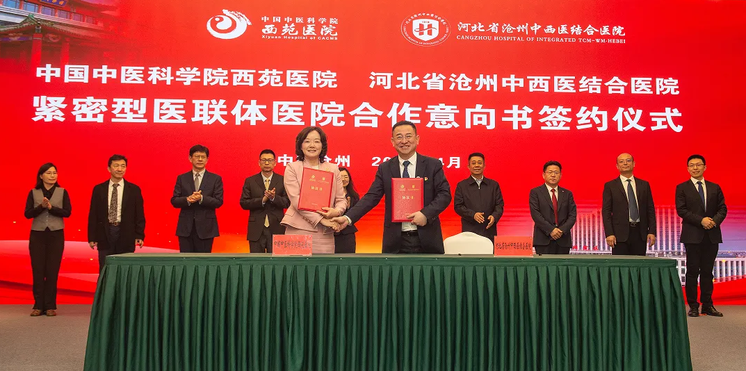 4月9日,中国中医科学院西苑医院党委书记李秋艳与河北省沧州中西医结合医院党委书记赵建勇代表双方签署紧密型医联体合作意向书。