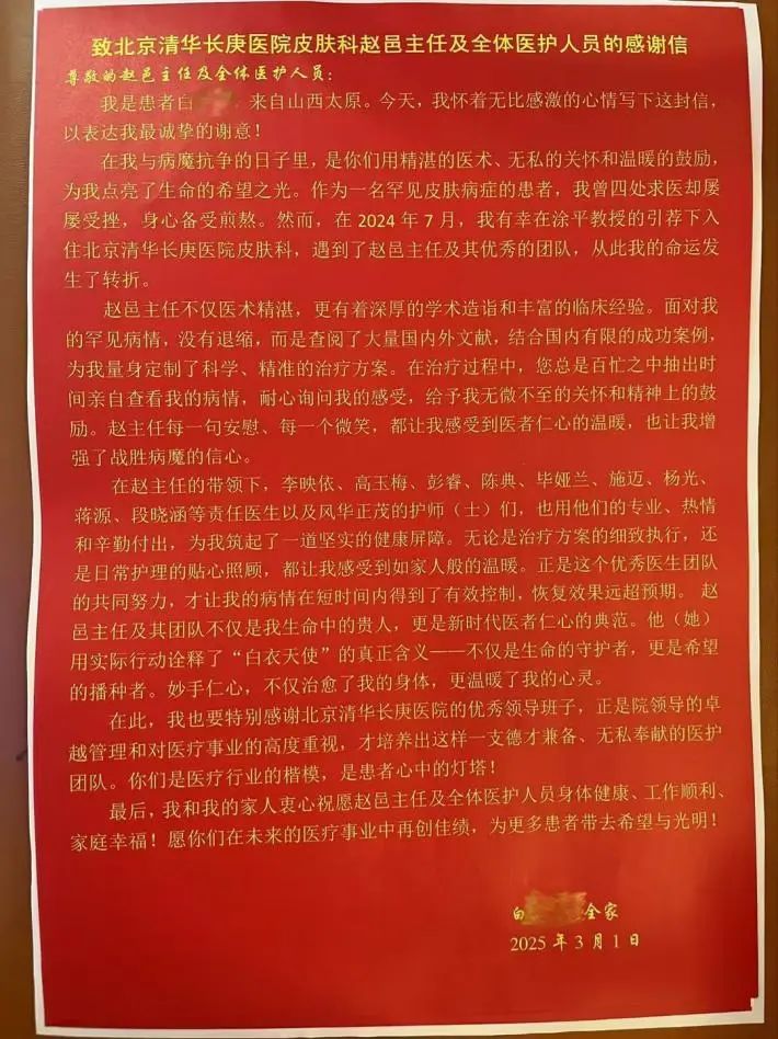 在医护团队的精心治疗和关怀下,白女士的病情开始好转。皮肤上的丘疹逐渐消退,关节疼痛减轻,嘶哑的声音和鼻塞的症状也有了显著的改善。更让她感动的是,治疗期间,医护人员们不仅细致执行治疗方案,还常陪她聊天疏解焦虑。“赵主任每一句安慰、每一个微笑,都让我感受到医者仁心的温暖,也让我增强了战胜病魔的信心。”白女士在感谢信中写道。