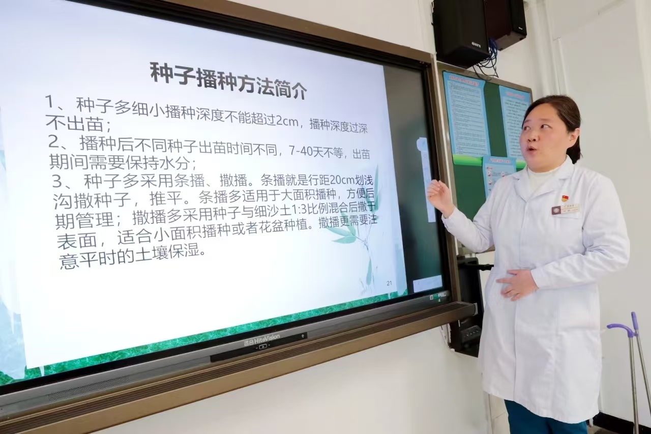 “我知道蒲公英,白色的花朵,一吹就散了!”“荆芥居然是猫薄荷?”“原来吃烤肉裹的叶子也是中药!”课堂上,两位药师带着学生们认识了荆芥、紫苏、藿香、鸡冠花、紫花地丁、蒲公英、马齿苋、益母草、板蓝根九种身边常见的中草药,并科普了种植门道,比如1cm深的窝深、10-15cm的间隔距离、“见干见湿”的浇水技巧。