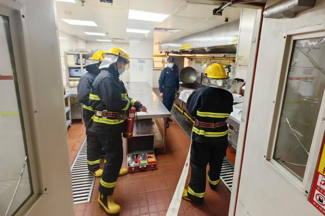 在针对食堂及后厨的消防演练中,模拟灶台着火。厨师立即关闭燃气,拉动灭火把手,取灭火毯盖住灶台。后模拟火势较大,立即按消防手报,同时疏散人员。消防微站人员在接到报警后迅速到位,按预案进行了灭火。