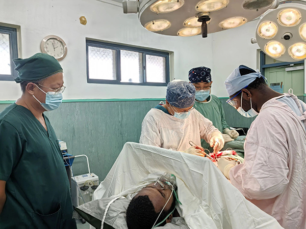 中国医疗队队员为难复性腹股沟疝患者做手术