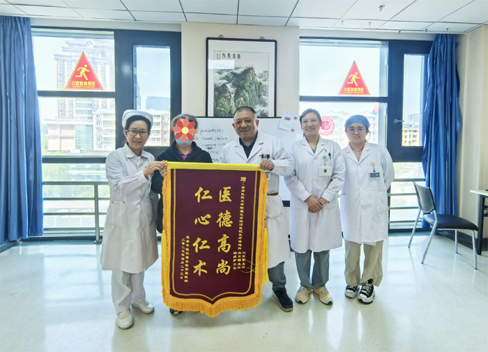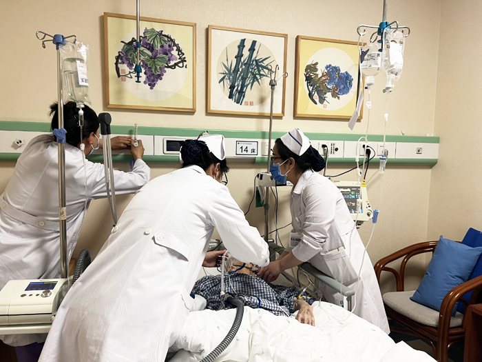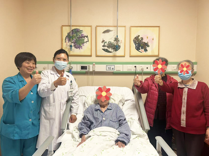 经过多学科认真分析讨论后,介入超声科医生为老人同时放置胸腔引流管和深静脉置管,配合相关专科指导药物的应用,老人的症状逐渐有了好转。之后,在营养科医生的会诊和指导下,给予老人肠内外营养支持。医疗保健病区的医护人员不仅给予了老人专业的治疗,还用温情真心安抚老人和子女的紧张心理,给予了他们家人般的温暖照护,得到了老人和子女的真心认可和感谢。最终在大家的共同努力下,老人经过近两周的精心治疗,终于转危为安并康复出院。