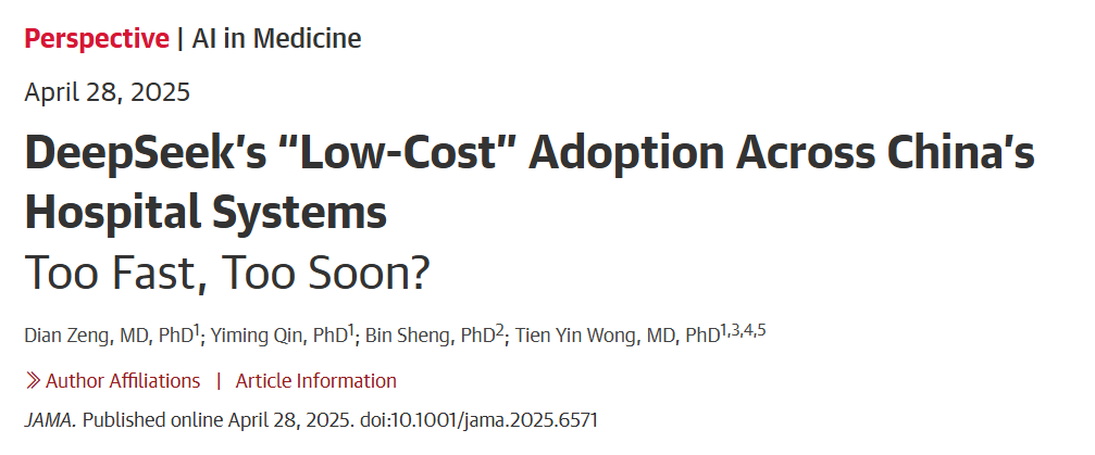 2025年4月,国际顶级医学期刊JAMA首次发表了关于中国自主研发大模型DeepSeek在医疗领域应用的观点文章。