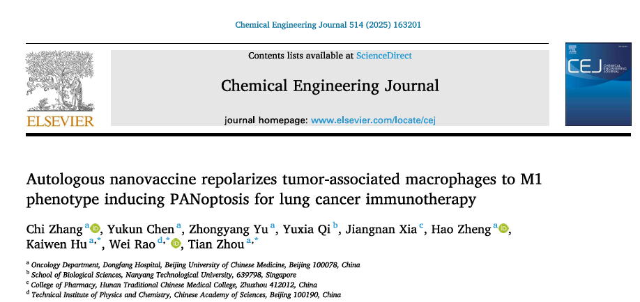 近日,北京中医药大学东方医院胡凯文、周天团队和中国科学院理化技术研究所低温科学与技术全国重点实验室饶伟团队联合在Chemical Engineering Journal上以“Autologous Nanovaccine Repolarizes Tumor-Associated Macrophages to M1 Phenotype Inducing PANoptosis for Lung Cancer Immunotherapy”为题,在线发表了成功研发主动靶向巨噬细胞的治疗性黄芪多糖自体肿瘤纳米疫苗的研究论文(IF=13.4,中科院1区TOP,JCR 1区),再次展示了医工结合、中西医结合治疗癌症的应用潜力。该研究基于中医 “扶正祛邪”经典理论,从全新角度诠释了在癌症治疗领域“扶正以祛邪”的现代内涵。该研究得到了国家自然科学基金面上项目资助。