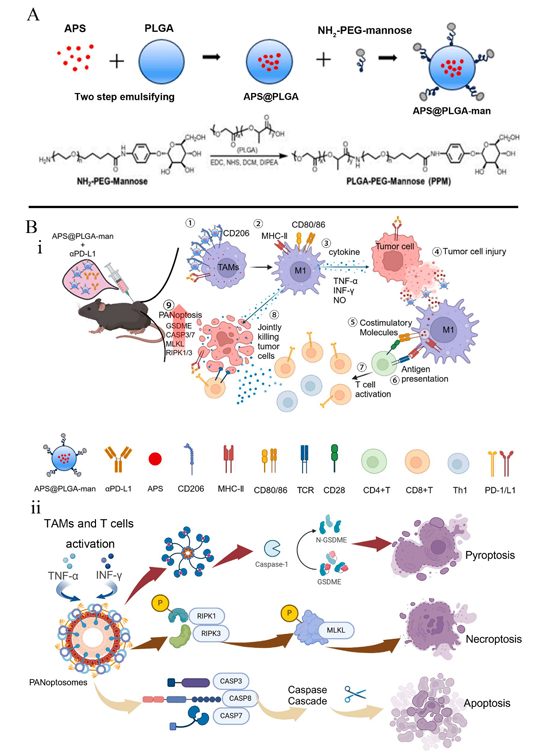 该创新方法通过巧妙的设计思路,将黄芪多糖封装于纳米载体中,显著增强了APS在体内外的稳定性,同时通过表面修饰赋予其对TAMs的主动靶向能力(APM)。由于该纳米颗粒具有pH敏感性,在TAMs摄取后,可在细胞内环境中促进APS释放,加速M1型极化过程。这一设计不仅确保了药物安全性,还广泛促进了TAMs的M1型极化以杀伤肿瘤细胞,同时富集肿瘤相关抗原,尤其是具有强大免疫原性的DAPMs和新抗原,显著增强巨噬细胞的抗原呈递能力,激活CD8+T细胞和Th1细胞。由此产生丰富的多样性细胞因子可诱导肿瘤细胞发生不可逆PANoptosis,进一步释放大量肿瘤抗原,形成正反馈环路,触发强大且持久的抗癌效应,最终获得显著的抑瘤效应和生存获益。与免疫检查点抑制剂联用可取得良好的协同增效作用。