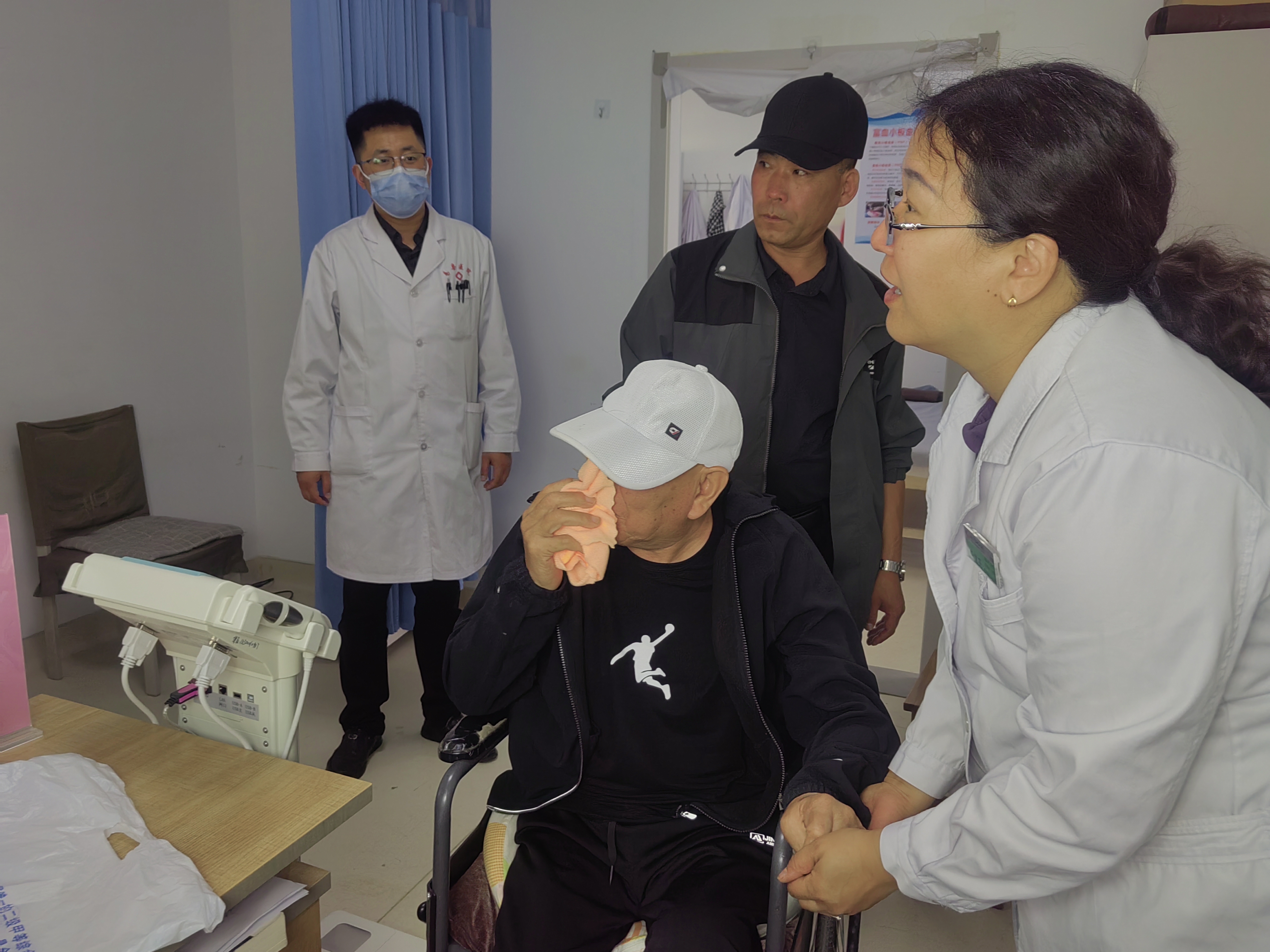 康复医学科尚俊英主任医师搀扶偏瘫大爷示范拉伸动作,诊床秒变“康复训练小课堂”