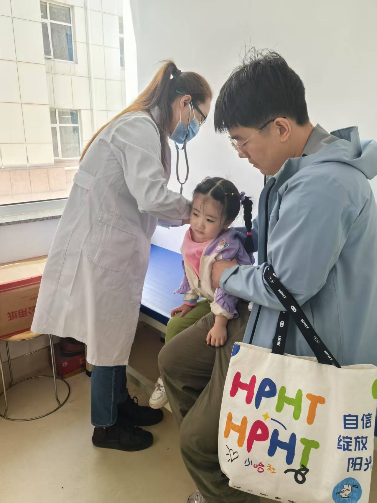 儿科刘瑞可主任医师,蹲身平视过敏患儿,腕间卡通手表随着听诊节奏轻轻摇晃,义诊同时还为家长科普育儿知识,缓解焦虑情绪。