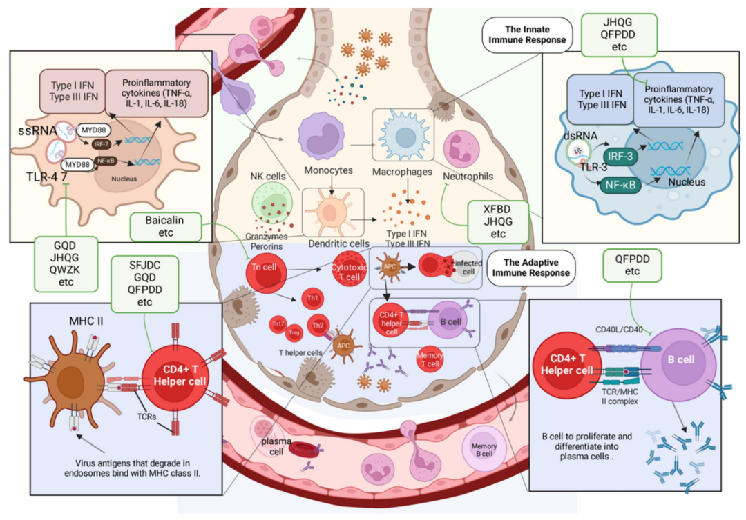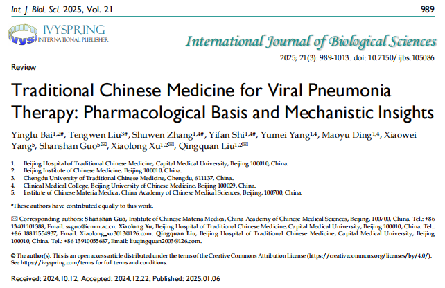 近日,首都医科大学附属北京中医医院刘清泉教授团队在《International Journal of Biological Sciences》杂志(IF:8.2,JCR1区Top)联合发表题为《Traditional Chinese Medicine for Viral Pneumonia Therapy: Pharmacological Basis and Mechanistic Insights》的长篇综述文章,系统综述了中药在干预呼吸道病毒感染、调节宿主免疫功能、器官保护、调节宿主代谢功能等方面具有多靶点、多途径的功能,突出通过多组分、多途径、多靶点复杂网络的特点发挥其独特优势,充分体现了中医“同病异治”和“异病同治”的指导思想。