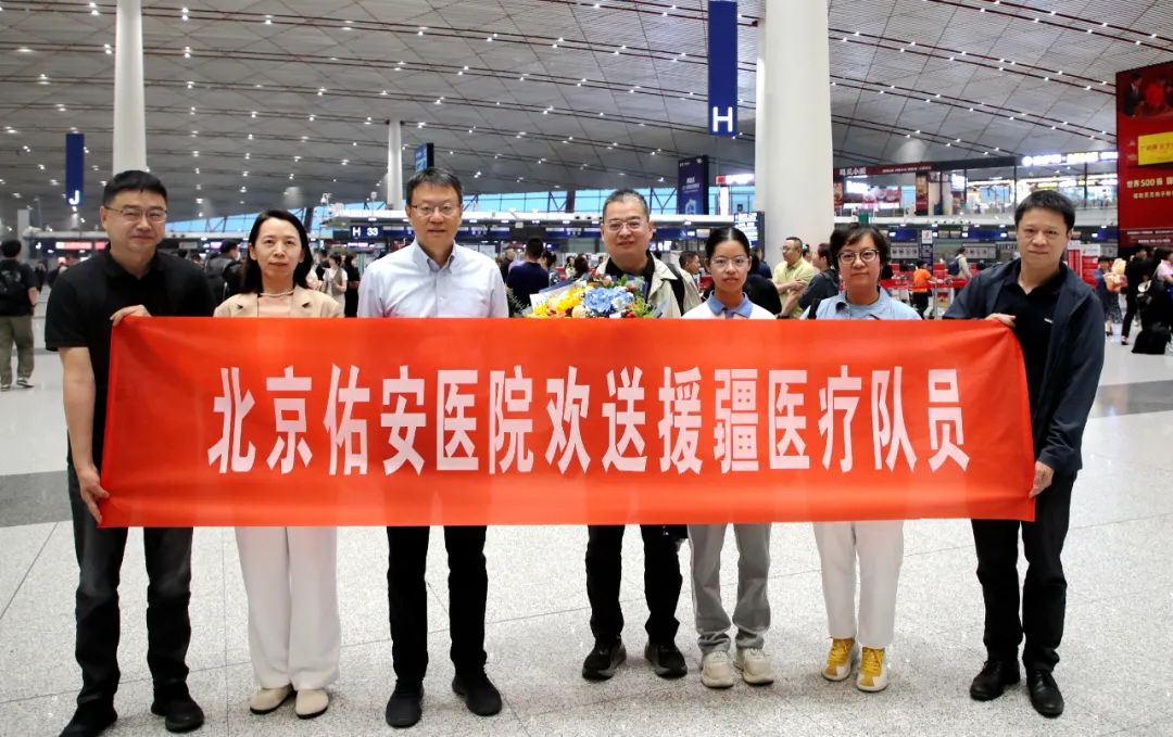 5月20日上午,北京佑安医院党委书记郑东翔,党委办公室主任张晓静,医疗质量管理办公室主任段忠辉,普通外科中心副主任曾道炳以及张海涛的家人来到北京首都国际机场,欢送援疆干部、普通外科中心副主任医师张海涛出征。张海涛同志作为北京市卫生健康系统2025年援疆医疗队队员赴和田地区传染病专科医院挂职副院长执行一年援疆任务。
