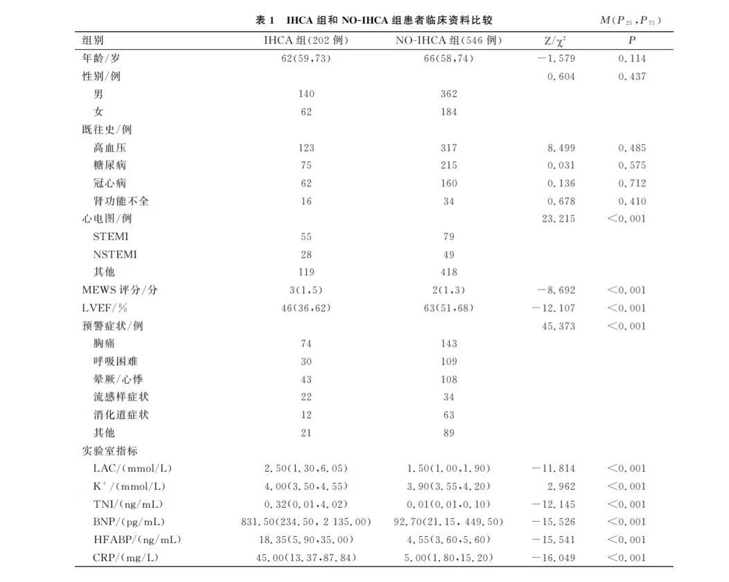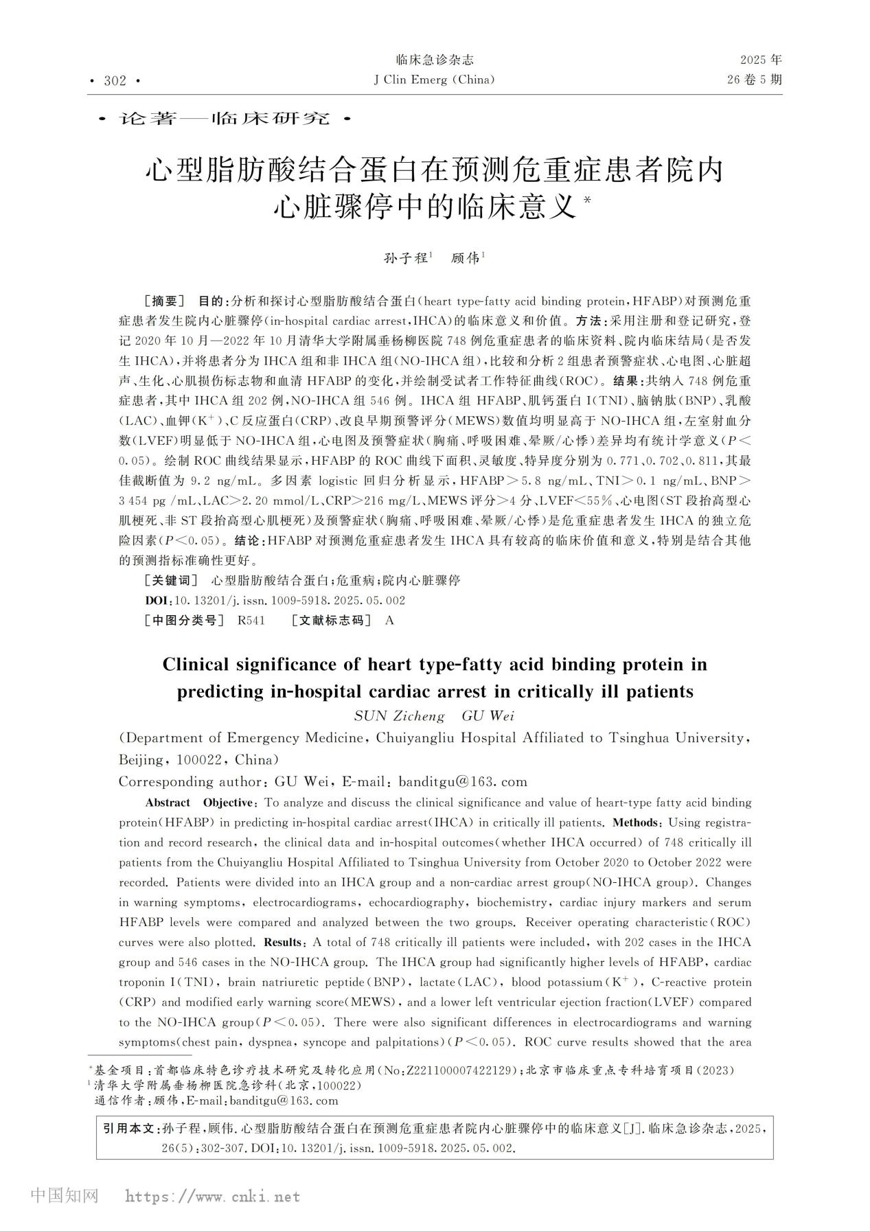 心脏骤停具有发病急骤和死亡率高的特点,是全球范围内十分严峻的重大公共卫生问题之一。相关研究显示,中国成人IHCA发病率为8.4‰,30天存活出院率为9.4%。IHCA是危重症患者死亡的主要原因之一,但传统监测手段(如意识状态、生命体征)往往难以早期发现其风险。HFABP是主要存在于心肌细胞中的低分子蛋白,其在心肌细胞受损早期即可迅速释放入血,是心脏早期损伤的标志物,既往研究提示HFABP是诊断心脏相关疾病的重要临床指标。目前国内外关于HFABP对危重症患者发生IHCA预测能力的相关研究较少,本研究旨在探索HFABP对危重症患者发生IHCA的预测价值和临床意义。