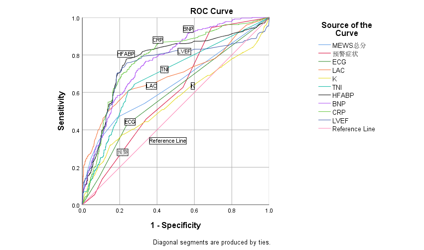 通过分析ROC曲线得出,HFABP、MEWS评分、LVEF、LAC、K+、TNI、BNP和CRP的最佳截断值分别为9.2ng/mL、4分、42%、1.95mmol/L、4.6mmol/L、0.035ng/mL、341pg/mL和26.6mg/L,HFABP的AUC大于TNI,且特异度和灵敏度优于TNI,见表2。