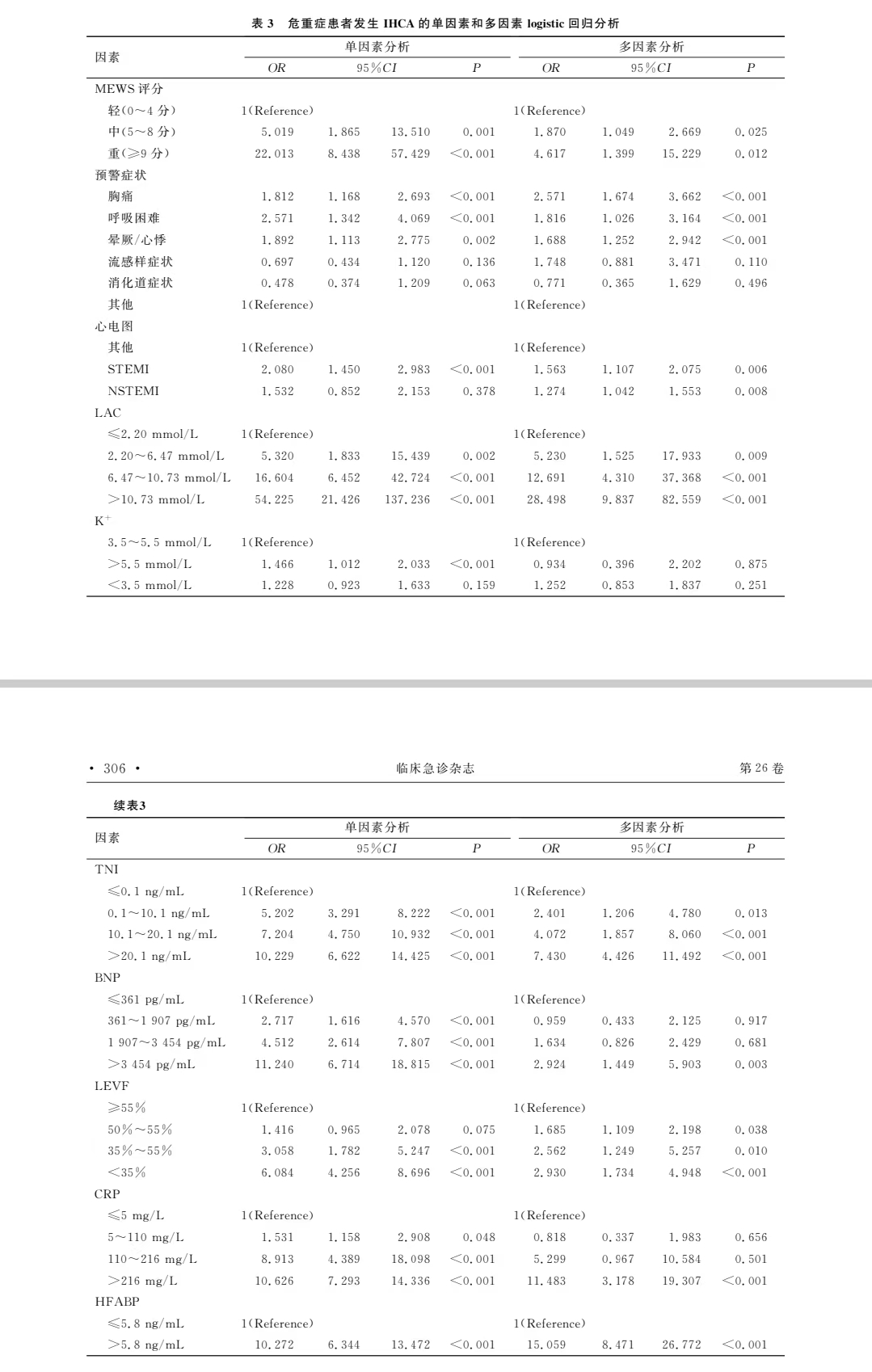 本研究收集危重症患者的临床资料,并把危重症患者分为IHCA组和NO-IHCA组,统计学分析结果显示,IHCA组和NO-IHCA组在心电图、MEWS评分、LVEF、预警症状及实验室指标(HFABP、LAC、K+、TNI、BNP、CRP)方面均具有显著的统计学差异(P<0.05),见表1。