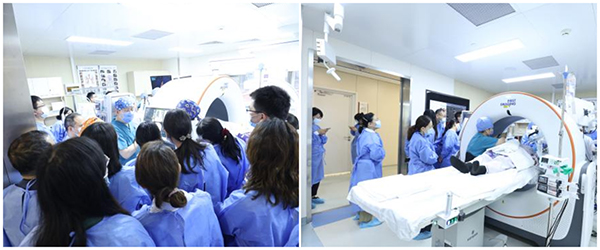 呼吸介入技术在肺癌诊治中发挥着重要作用。本次参访中,呼吸与危重症医学科常务副主任王峰分享了如何一步步建立以肺结节的精准诊断与微创治疗技术为核心的科室特色。主治医师李婉进行了呼吸介入诊断及治疗应用典型病例的分享。在介入实操环节,安排了三台活检取材手术供现场观摩学习,包括O型臂下机器人辅助支气管镜肺结节活检术、电磁导航支气管镜肺内多发病变活检术、超声支气管镜下纵隔淋巴结穿刺活检,以及肺部肿瘤超声支气管镜下PTS注射治疗等多项技术。参访学员实地见证了北京朝阳医院呼吸与危重症医学科的规范操作流程、先进设备以及关键技术要点,学习热情高涨,反响热烈。