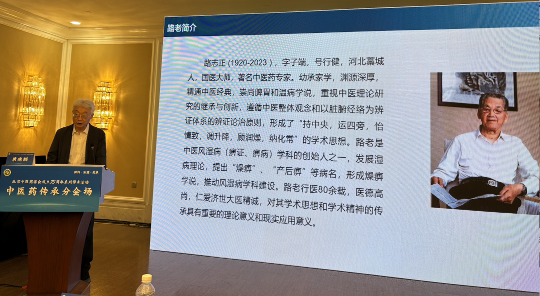 中国中医科学院广安门医院唐晓颇作“国医大师路志正学术传承”演讲,介绍了路志正国医大师学术体系思想核心“十八字诀”——持中央,运四旁,怡情志,调升降,顾润燥,纳化常,强调脾胃为气血生化之本。