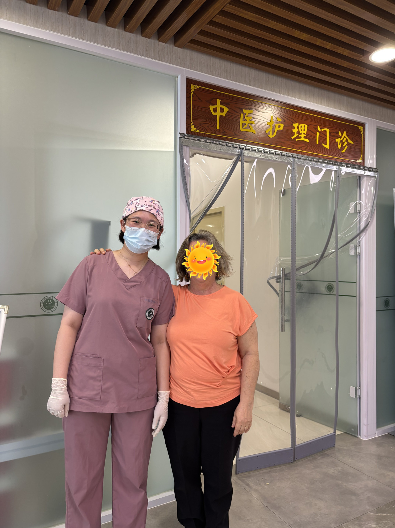 该患者因劳累,肩颈肌肉紧绷,面对语言障碍,钱雪萌护士耐心沟通,为她量身定制了温灸刮痧与热奄包组合疗法。艾灸的热力缓缓渗透经络,温灸罐推开淤堵的气血,配以活血化瘀的药包热敷,三重中医技法循序渐进。治疗过程中,钱雪萌用“Warm enough?”“Relax”等简单英文实时确认患者感受,专业手法与温暖关怀让患者逐渐放松。