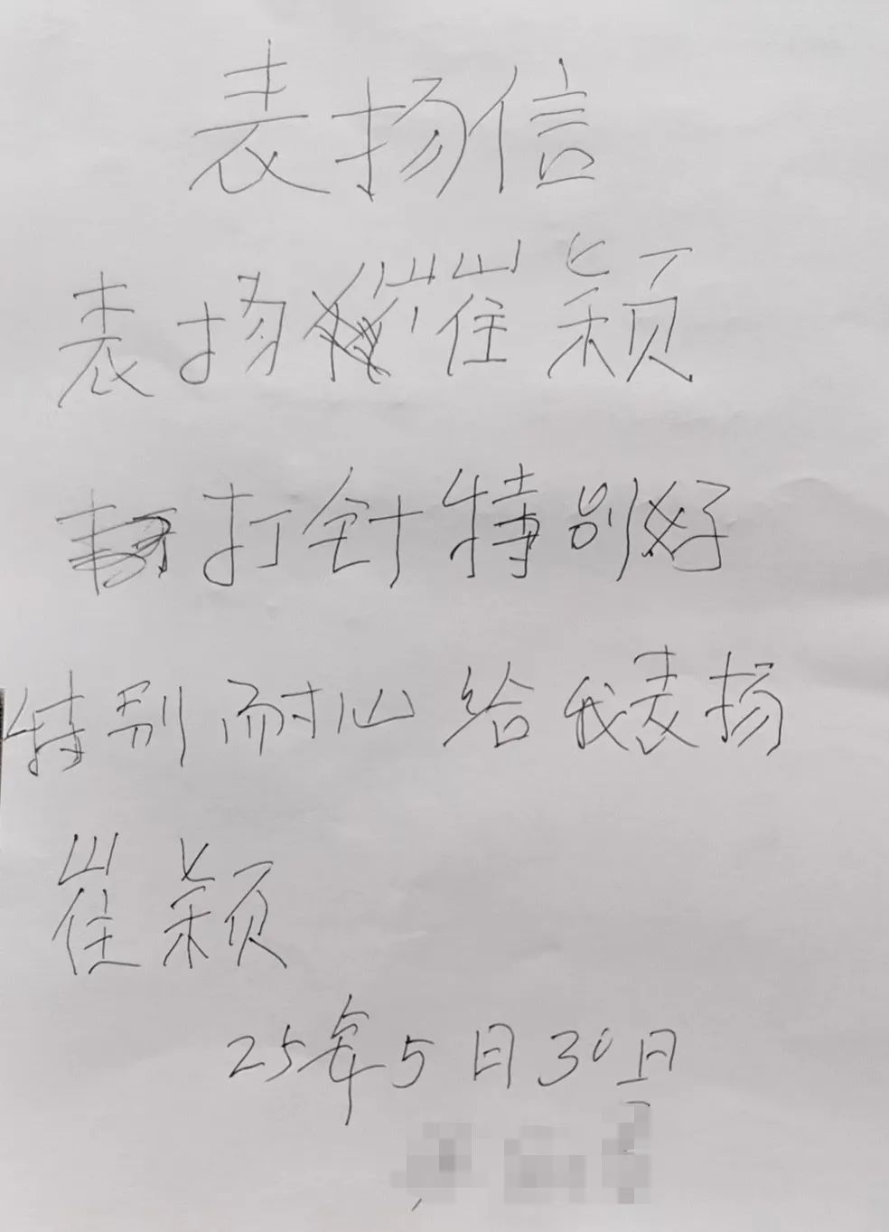 20分钟的观察时间到了,老人却径直走到护士站,拉住护士长的手连声道谢:“闺女,你们这儿的护士对我太好了!今天给我打针的小崔,就像妈妈哄孩子一样温柔,一点也不疼。我得好好表扬她!”说着,老人坚持要写感谢信,颤颤巍巍地在纸上写下:“表扬崔颖,打针特别好,特别耐心,给我表扬崔颖”。虽然字迹简短,却饱含真诚。
