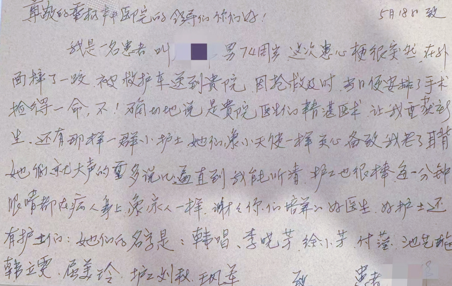 出院当日,屈大爷攥着护士的手反复致谢。尽管听力障碍让他吐字含糊,但眼神里的感激格外清晰。老人耗时三日、借助助听器拼凑出的感谢信中,“韩唱、李晓芳、徐小芳、付莹”等名字被反复涂改:这是他心中“天使团队”的温暖印记。