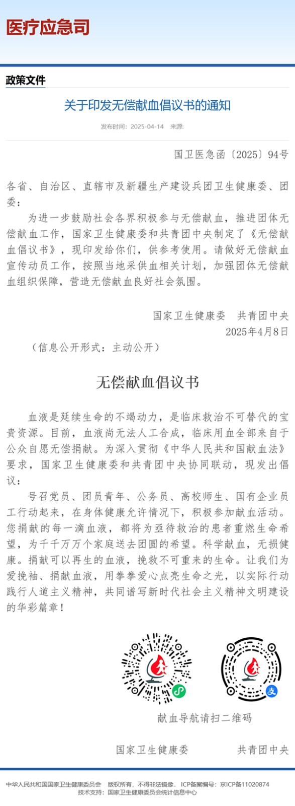 为进一步鼓励社会各界积极参与无偿献血,推进团体无偿献血工作,国家卫生健康委和共青团中央制定了《无偿献血倡议书》,号召党员、团员青年、公务员、高校师生、国有企业员工行动起来,在身体健康允许情况下,积极参加献血活动。您捐献的每一滴血液,都将为亟待救治的患者重燃生命希望,为千千万万个家庭送去团圆的希望。