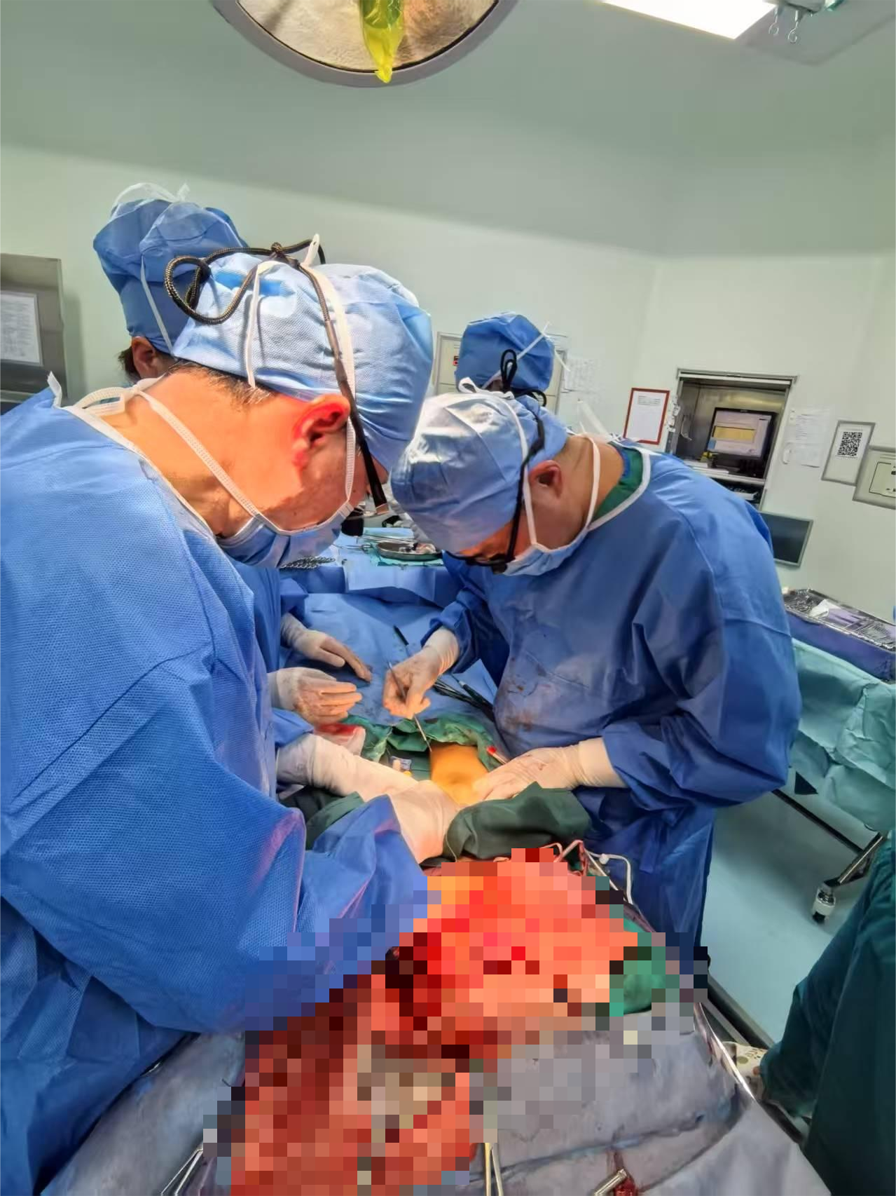 北京儿童医院王焕民、北京医院刁永鹏等医护人员从患儿大腿内侧取大隐静脉,为患儿进行肠系膜上动脉血管替换